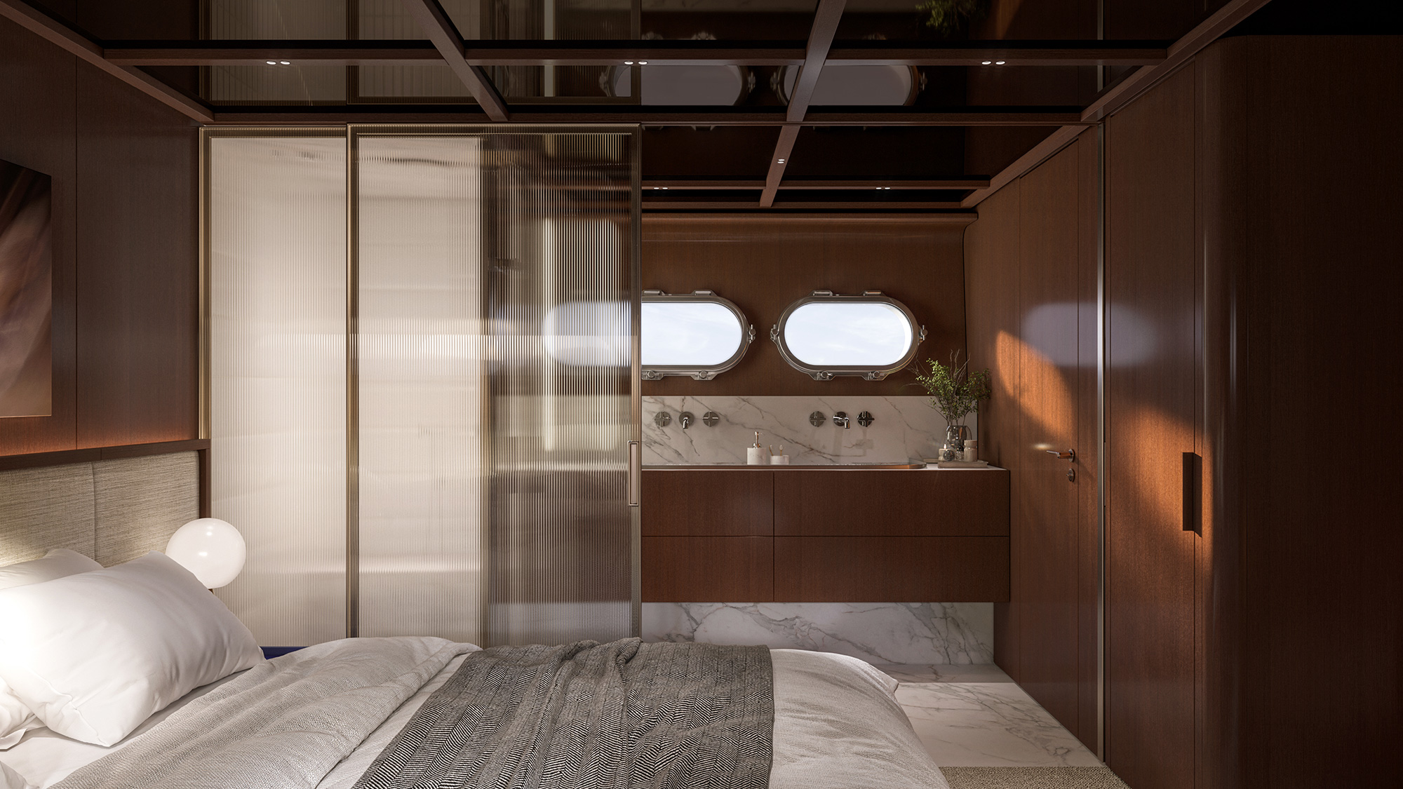 SHE reinterprets the stylistic codes of great classics of Italian yachting with a contemporary sensibility. The carefully coordinated interior design reflects this dual soul — both perpetual and modern.