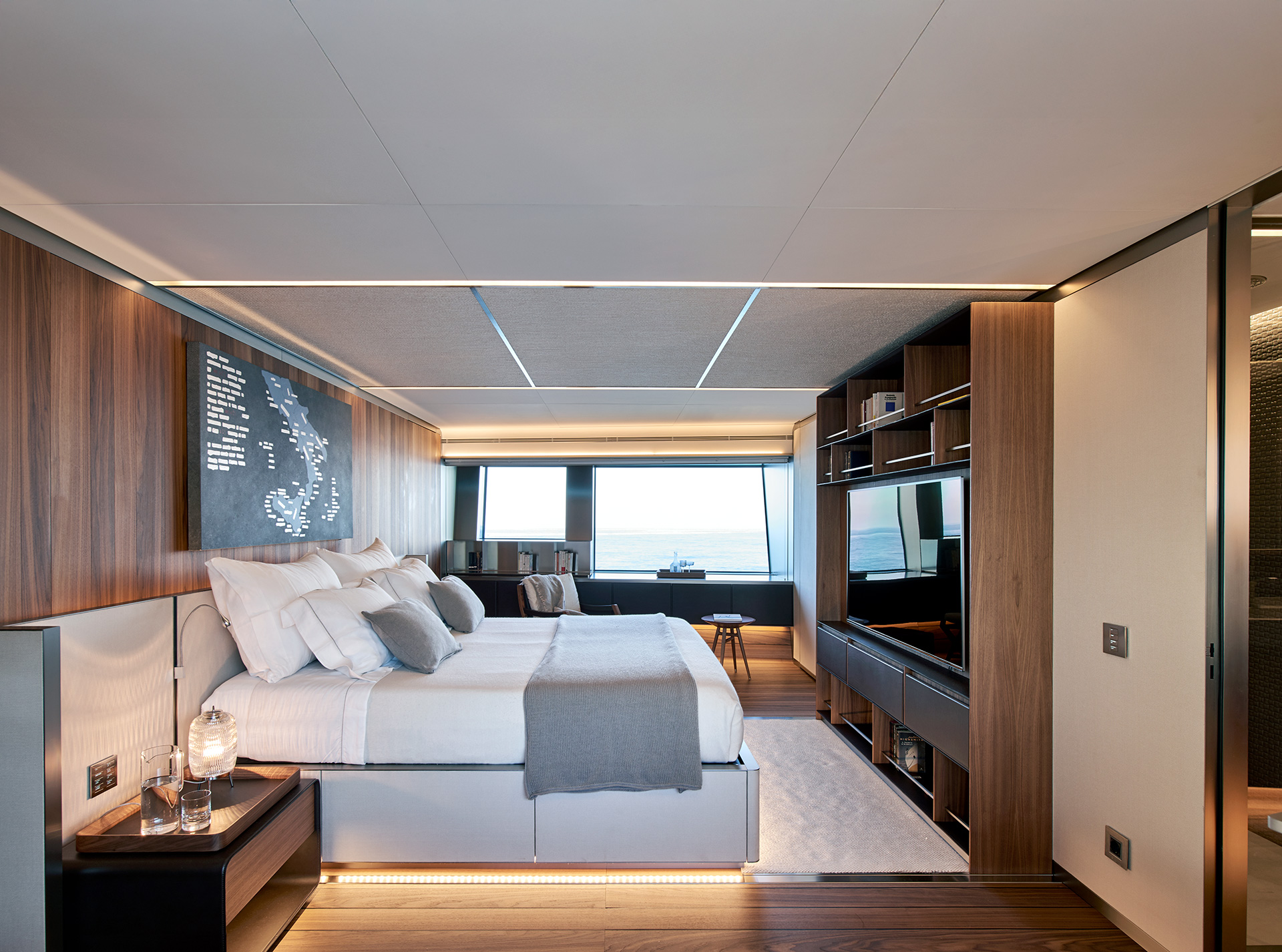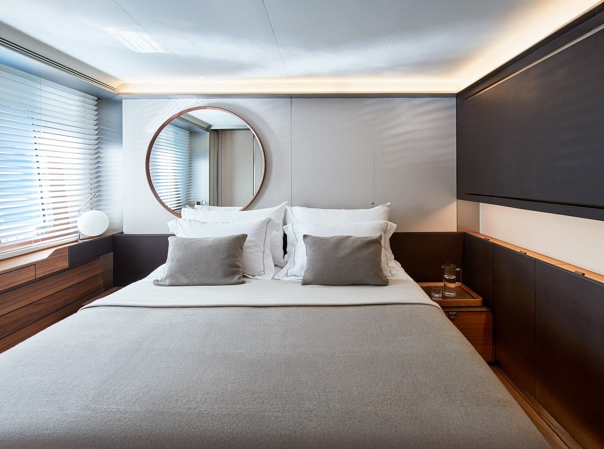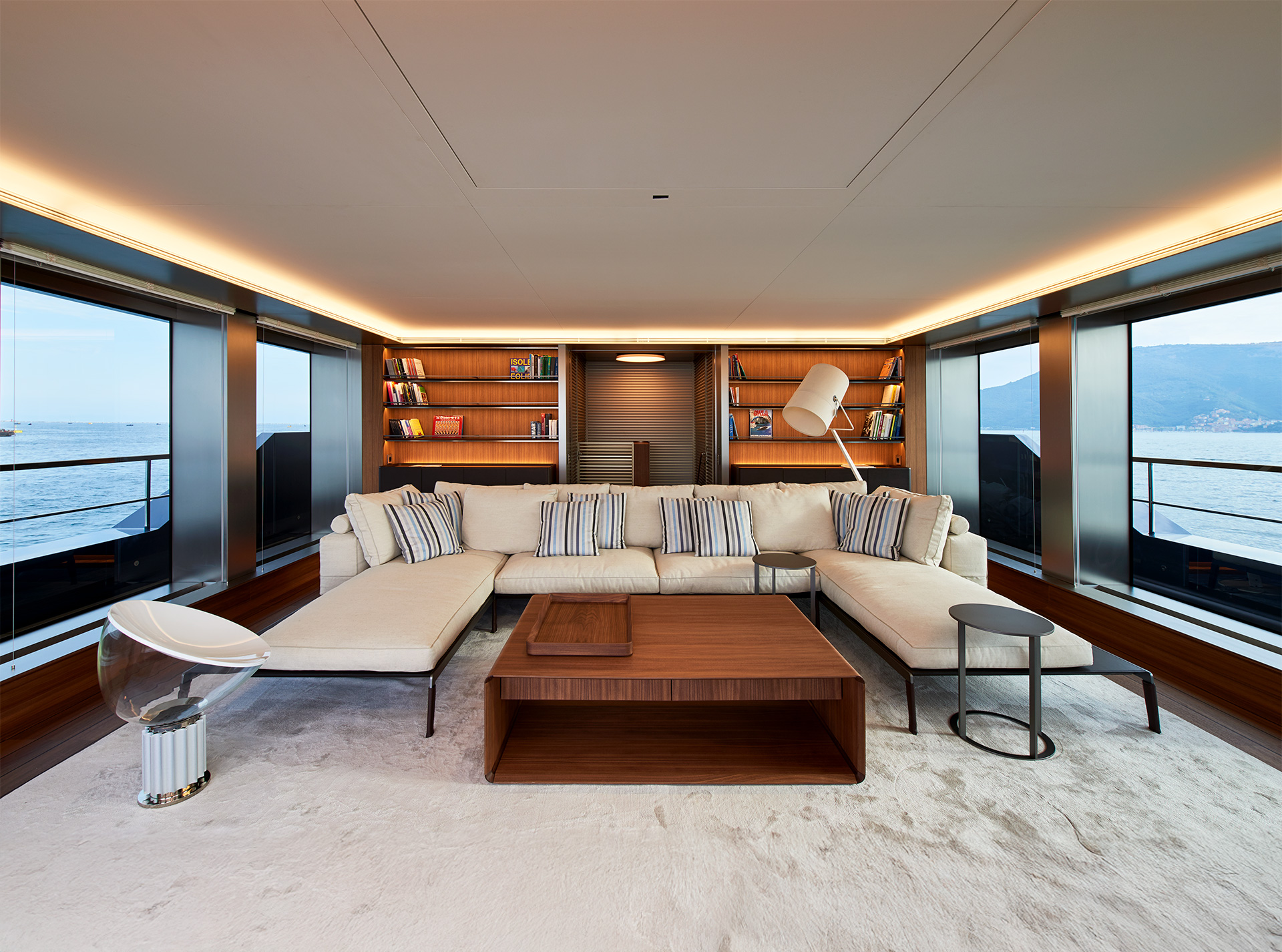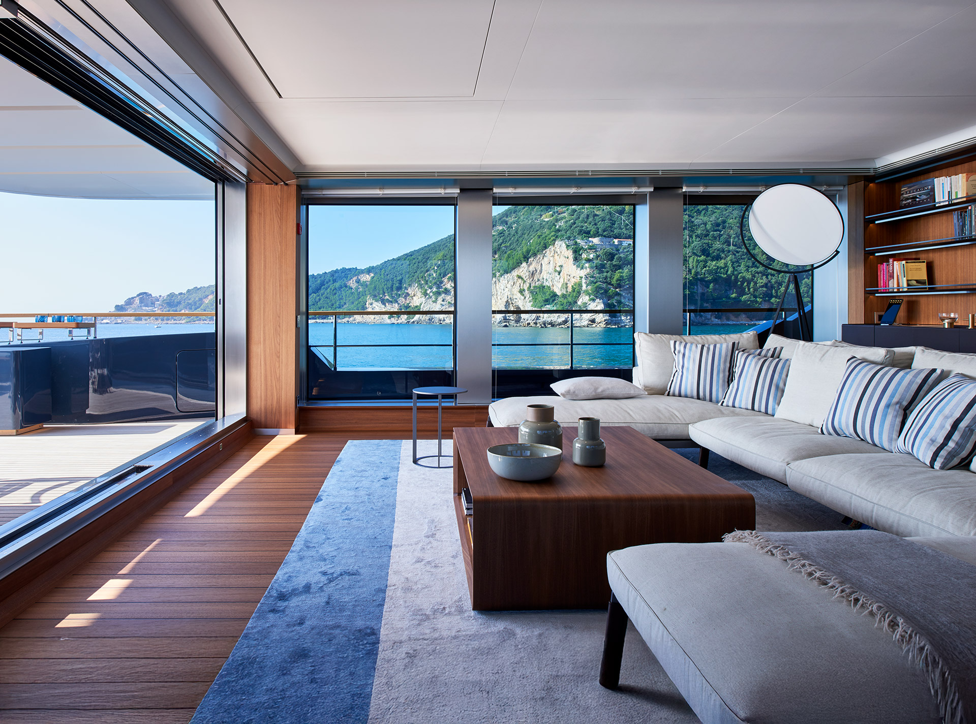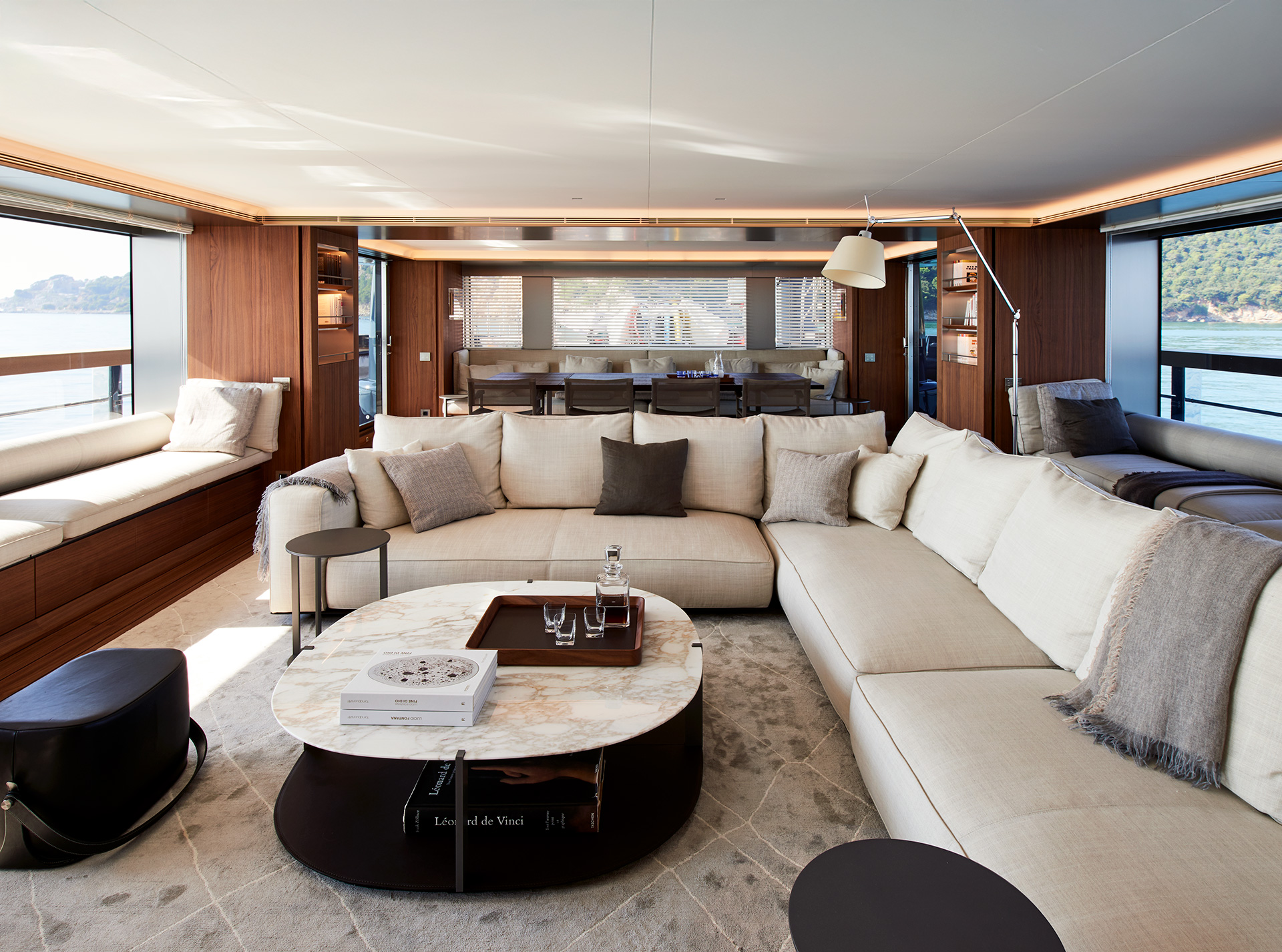 SHE reinterprets the stylistic codes of great classics of Italian yachting with a contemporary sensibility. The carefully coordinated interior design reflects this dual soul — both perpetual and modern.