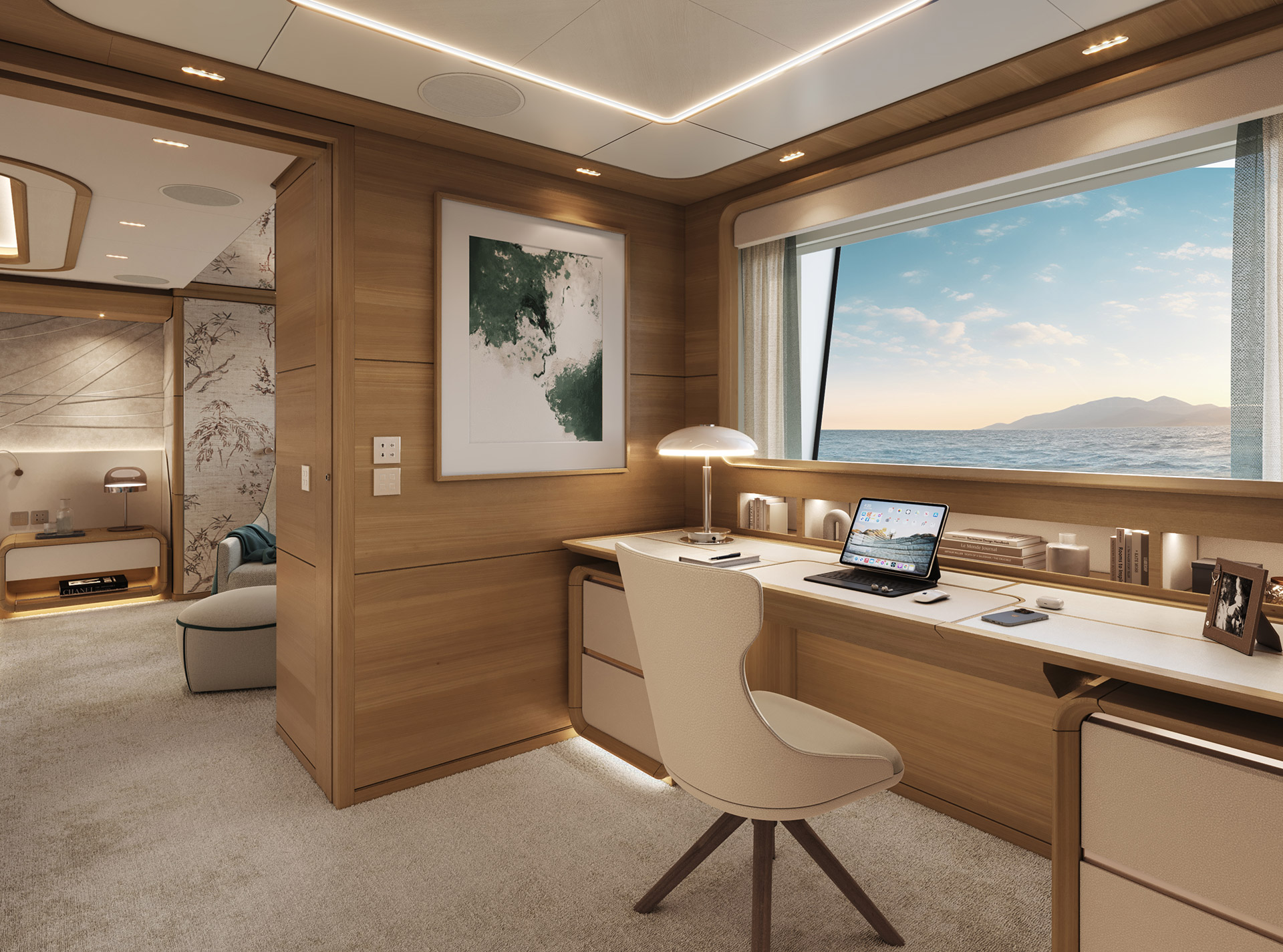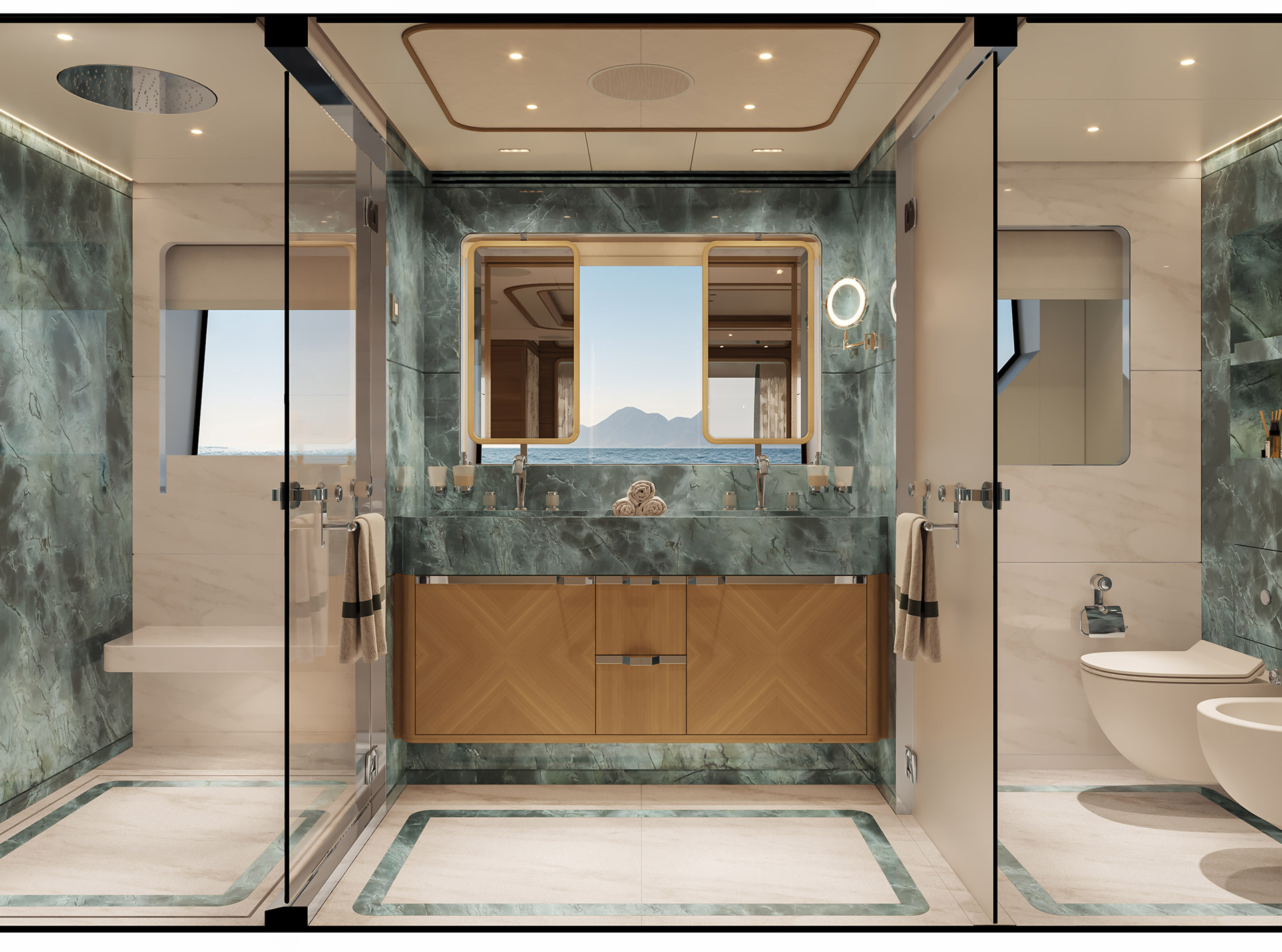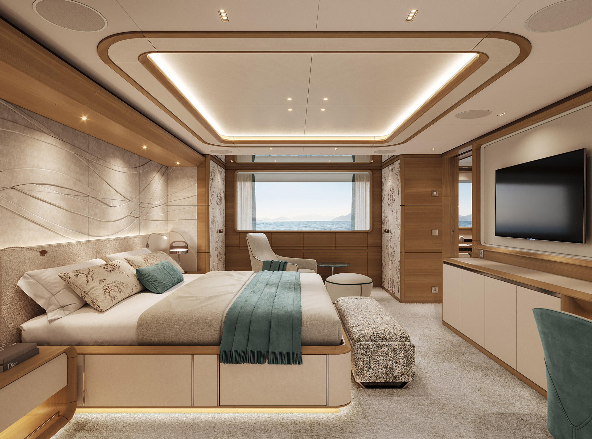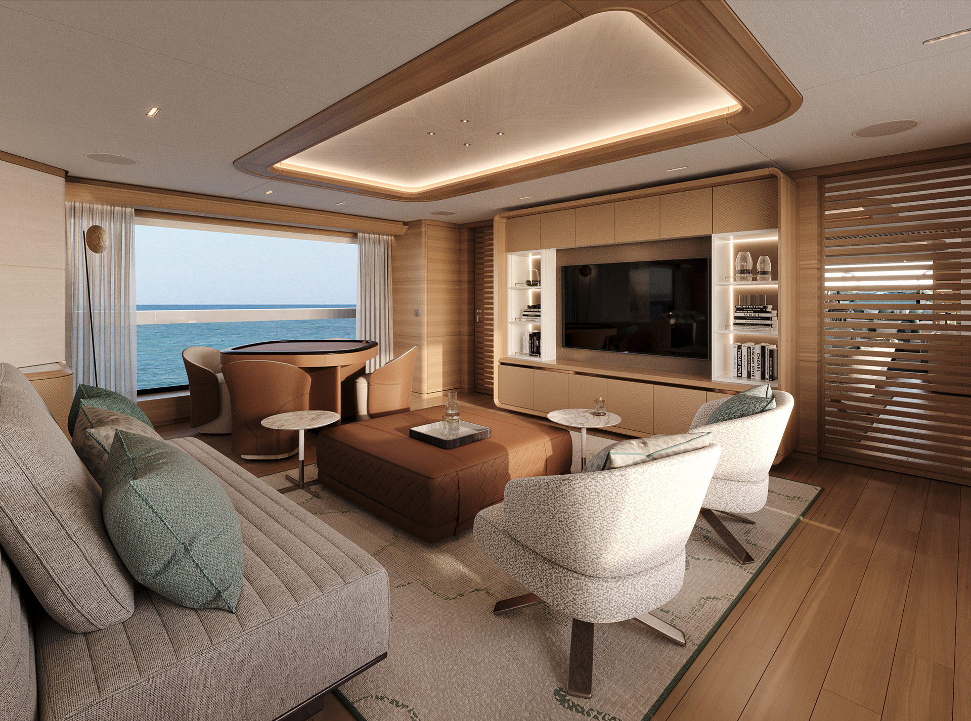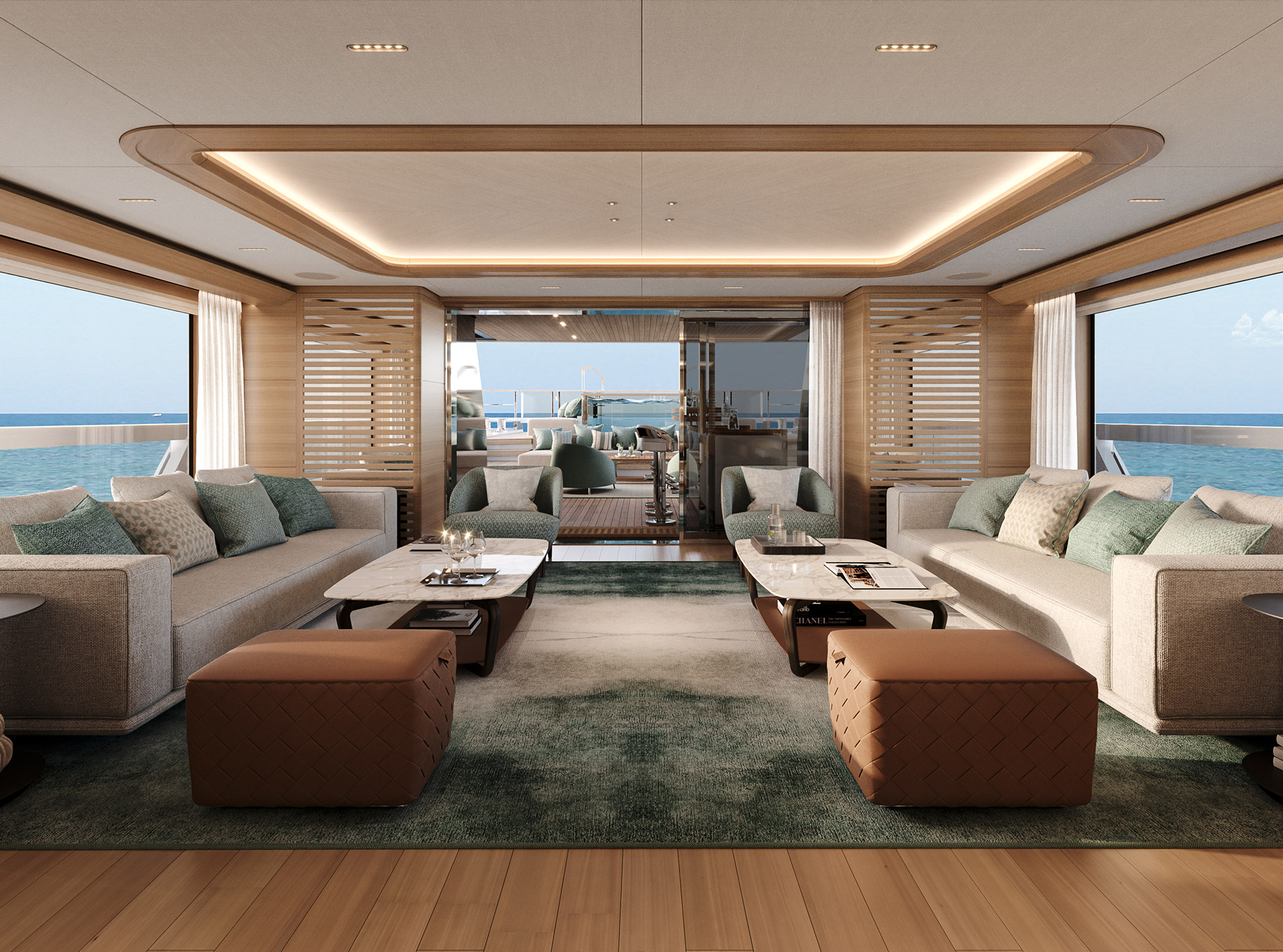 SHE reinterprets the stylistic codes of great classics of Italian yachting with a contemporary sensibility. The carefully coordinated interior design reflects this dual soul — both perpetual and modern.