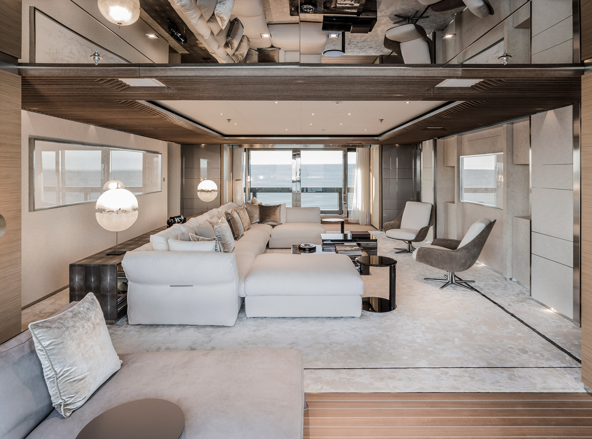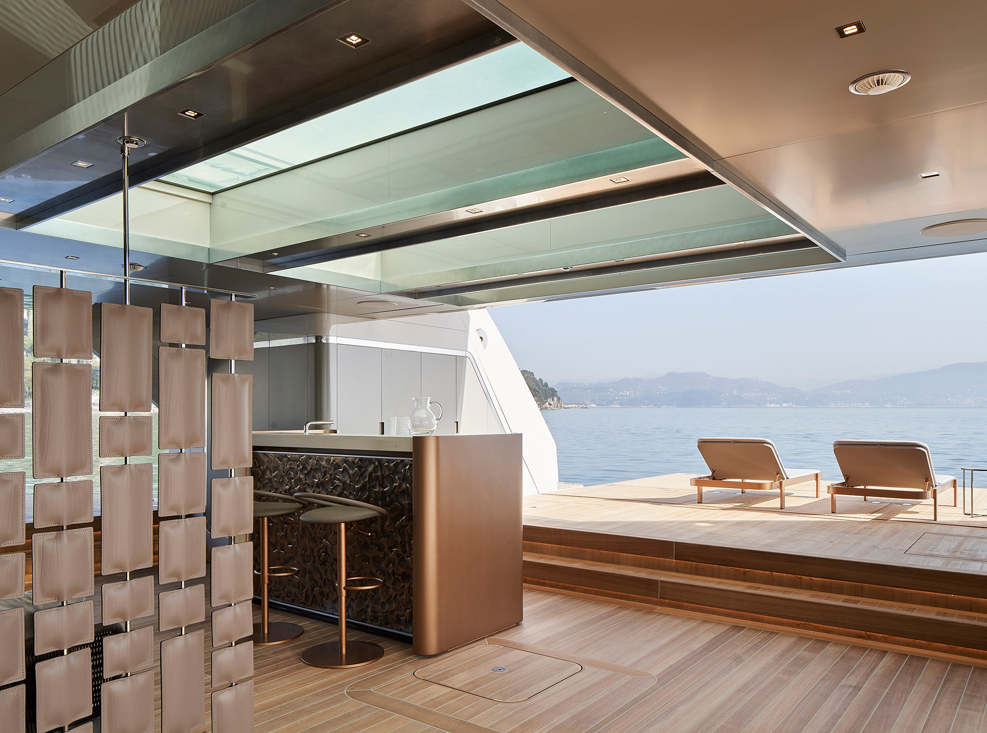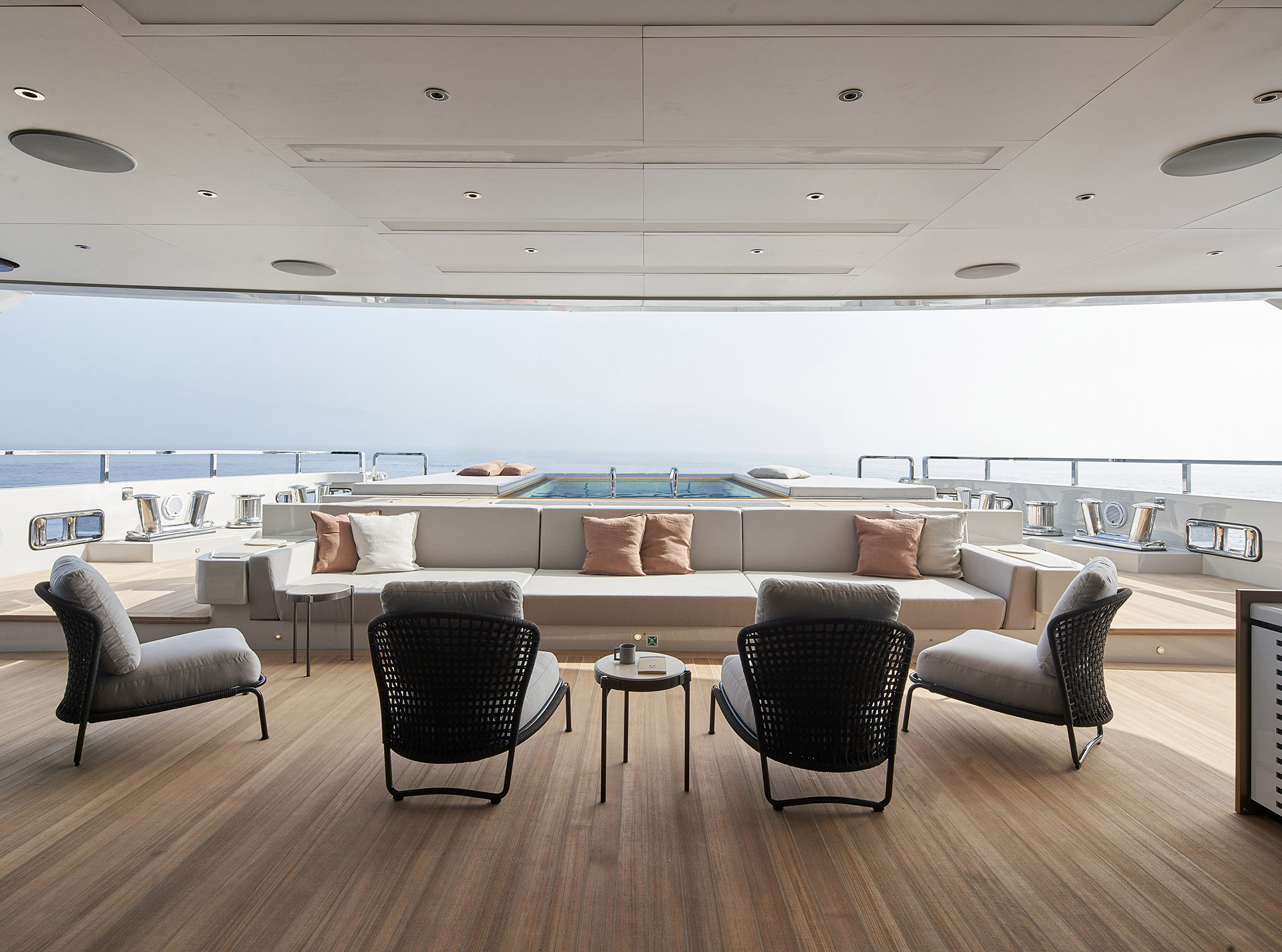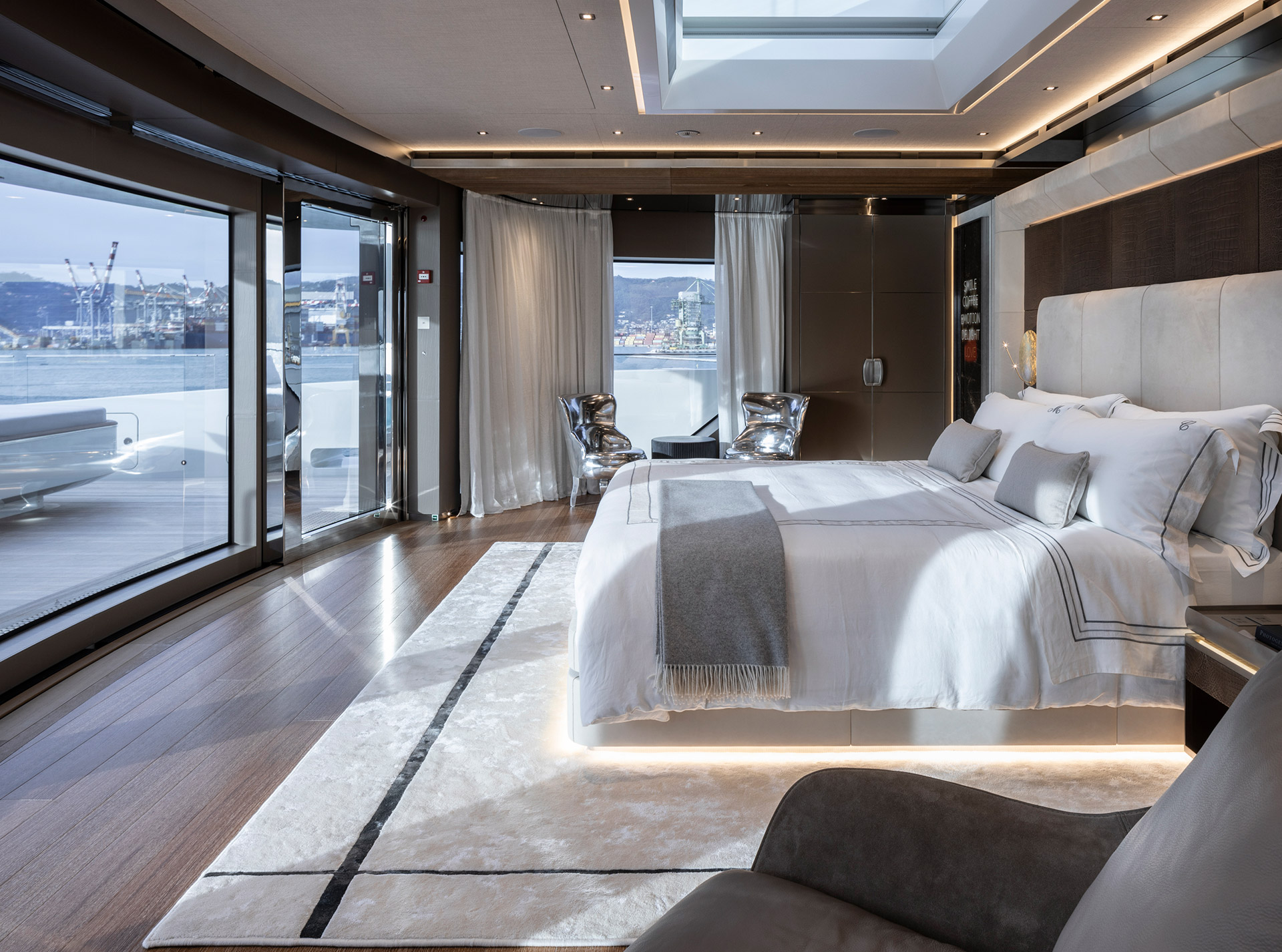 SHE reinterprets the stylistic codes of great classics of Italian yachting with a contemporary sensibility. The carefully coordinated interior design reflects this dual soul — both perpetual and modern.