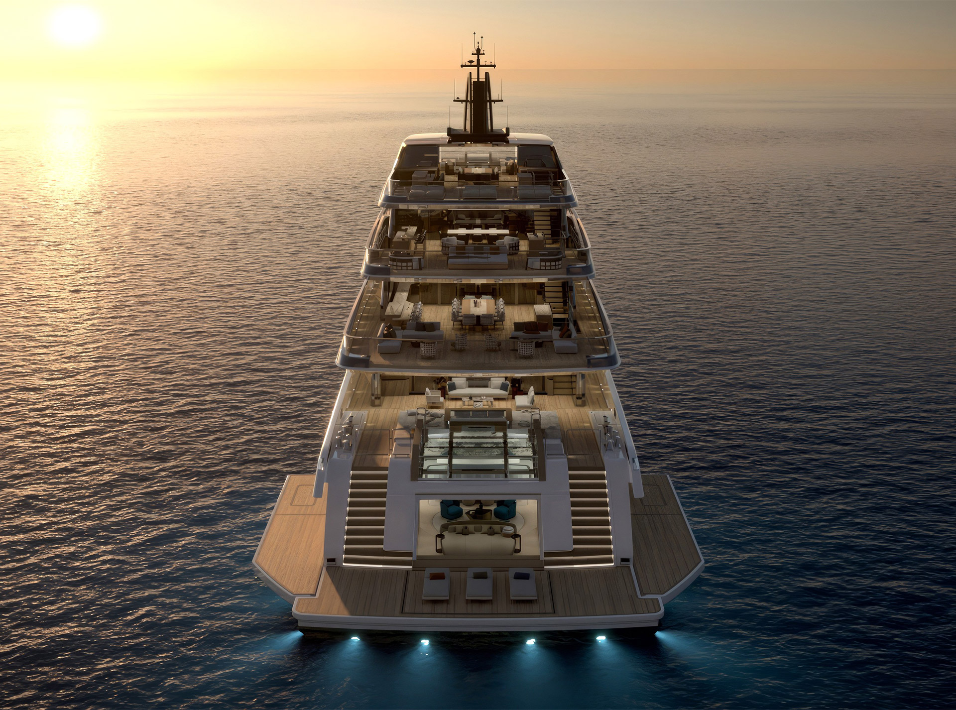 Smooth, elegant lines with a soft vertical bow and generous outdoor areas. The sun deck offers inviting spots for relaxing, and the wide beach club at the stern opens beautifully onto the sea.