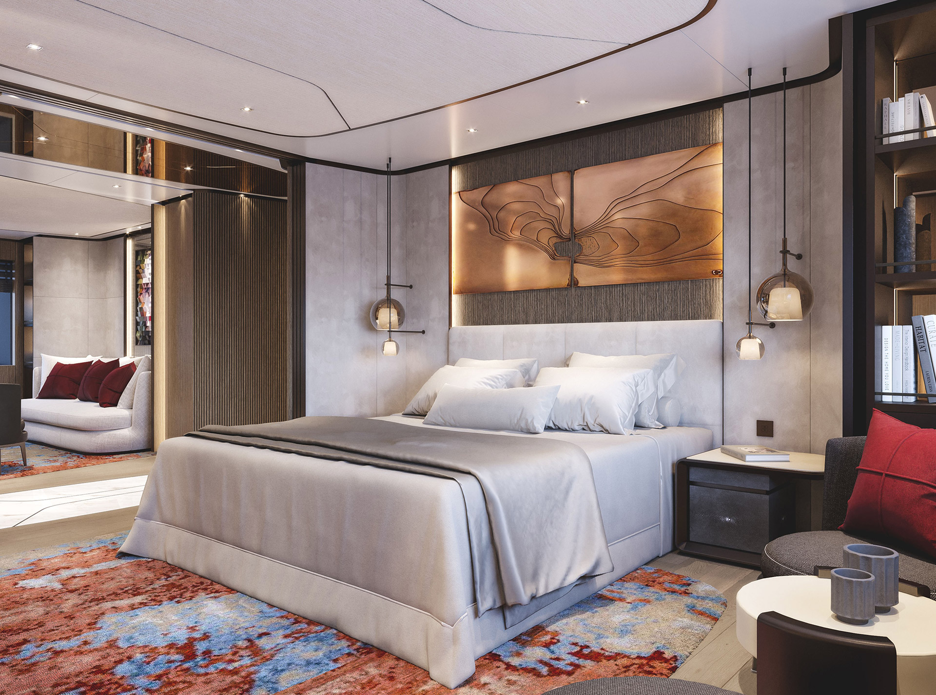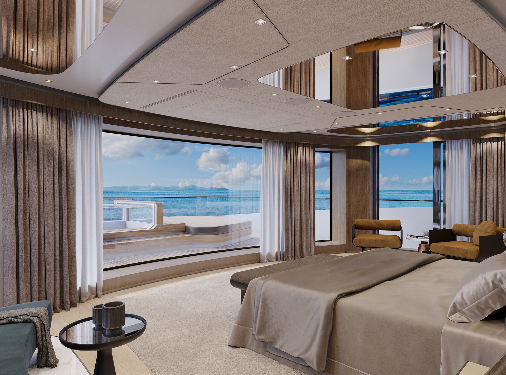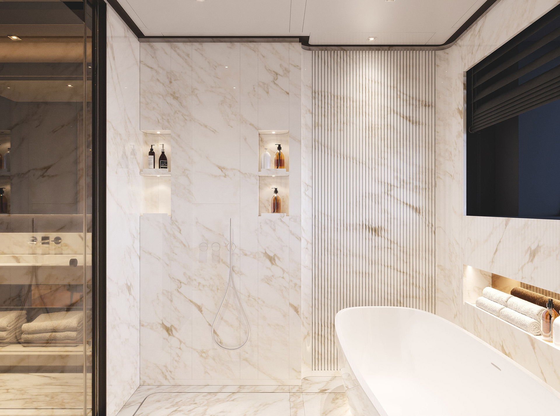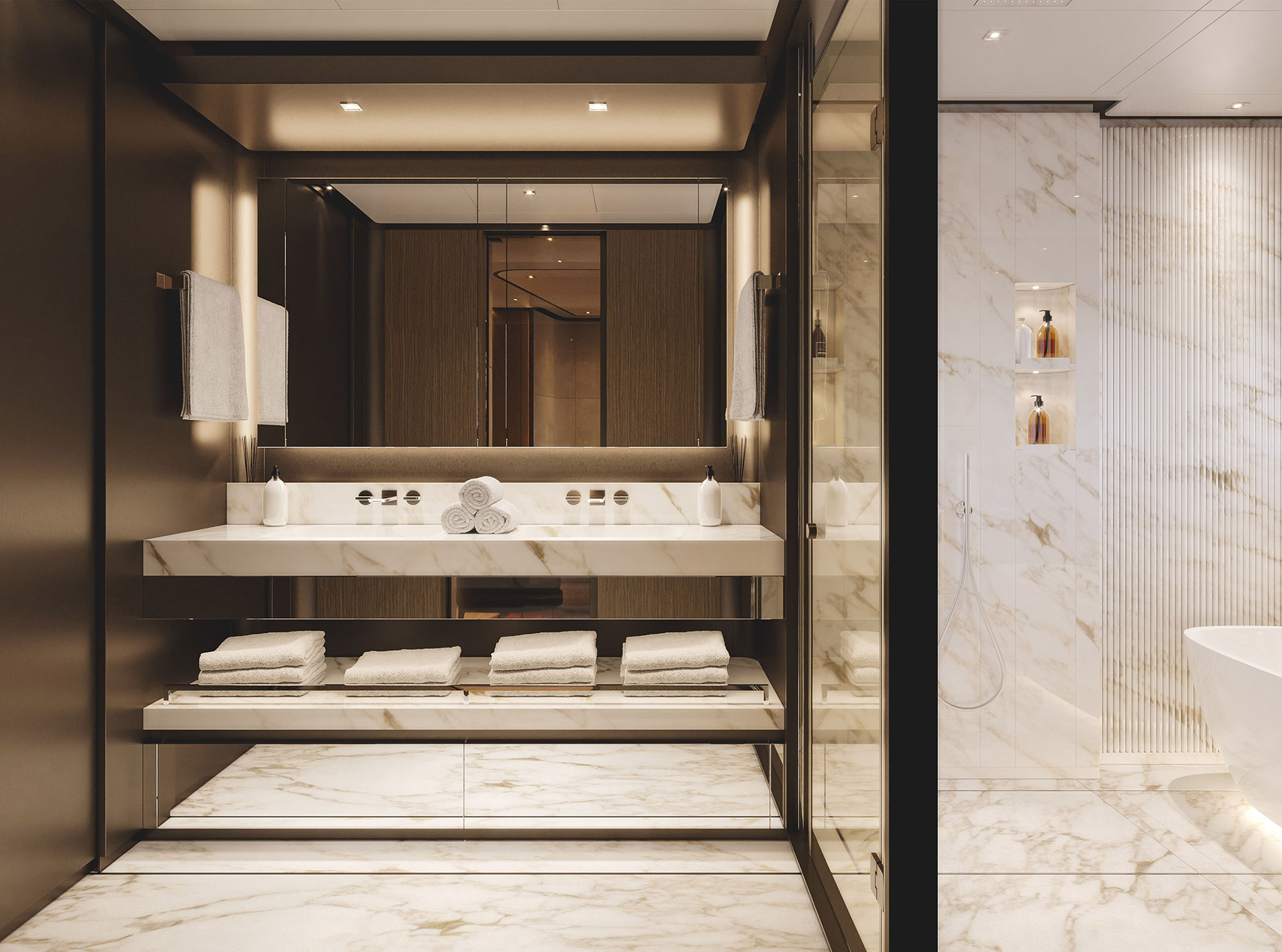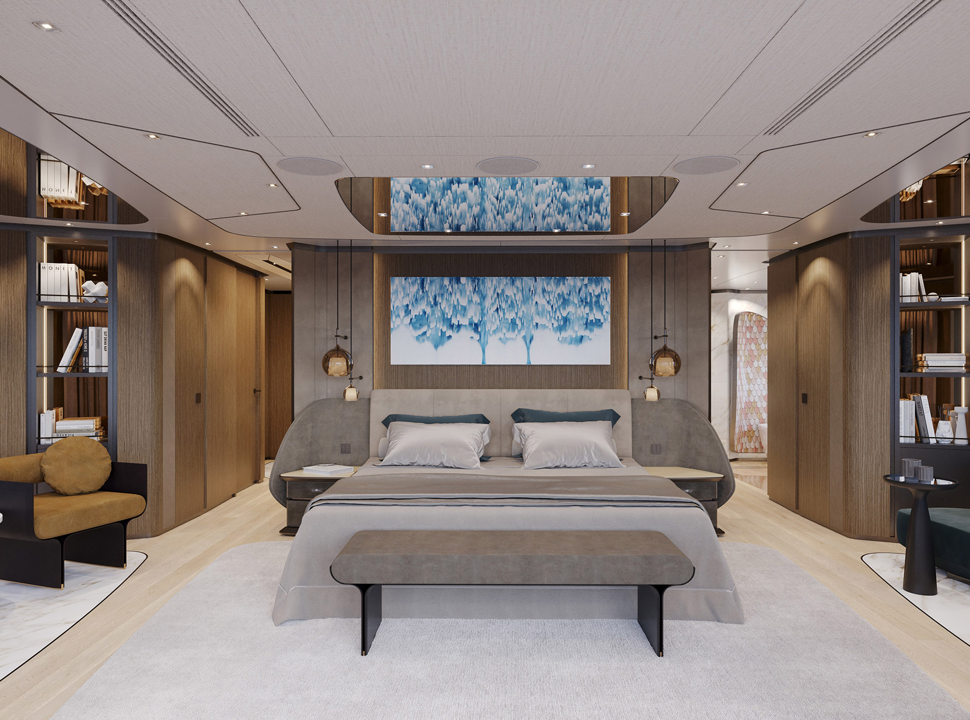 Gentle curves, matte woods and fine marbles create a serene, sophisticated setting, featuring comfortable living areas, a private owner’s space and a well-equipped wellness zone.