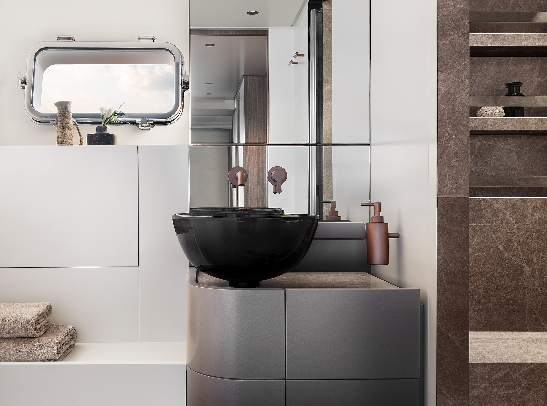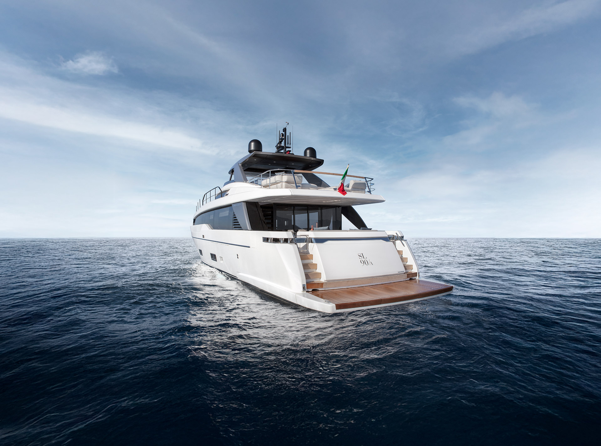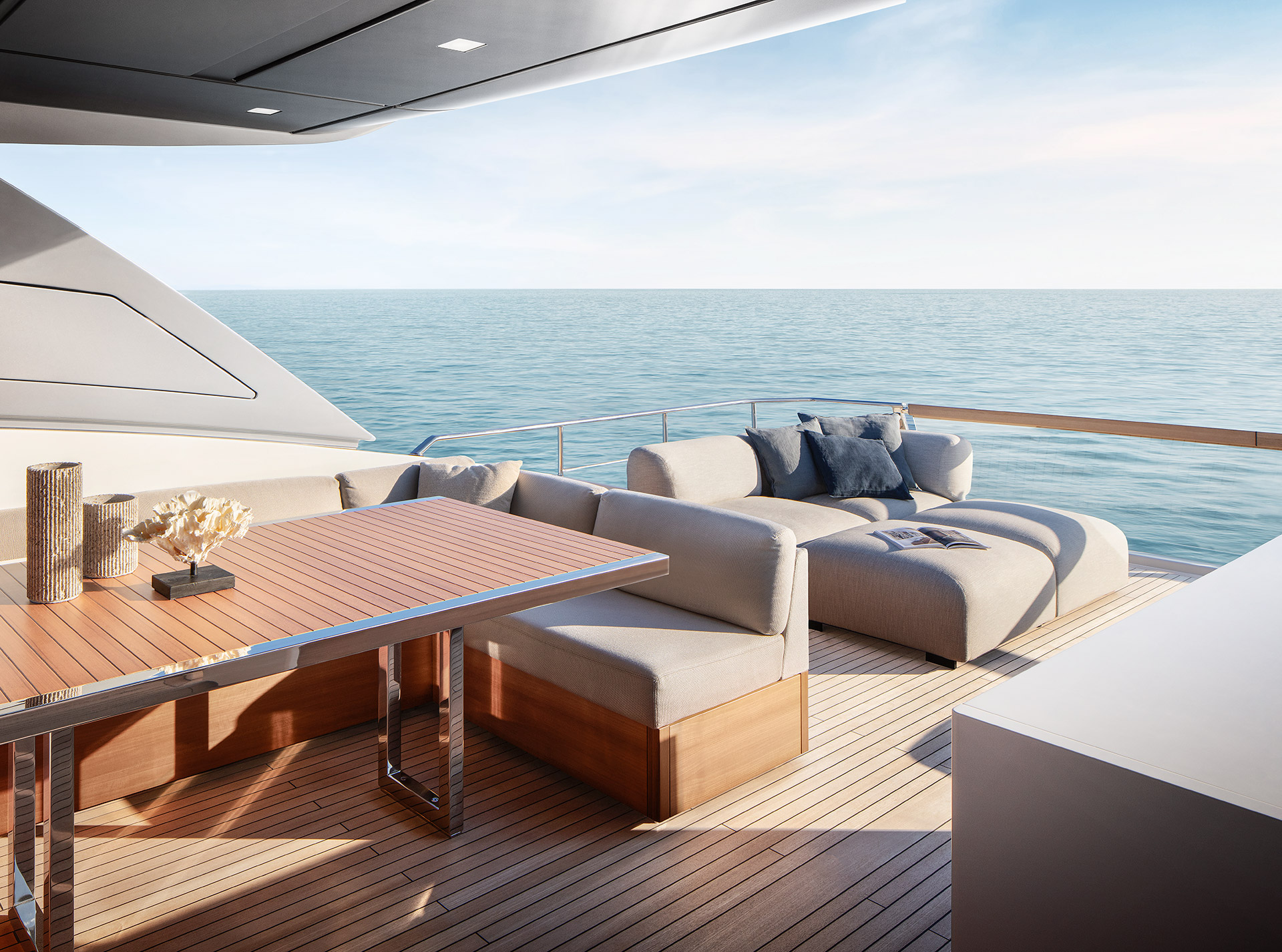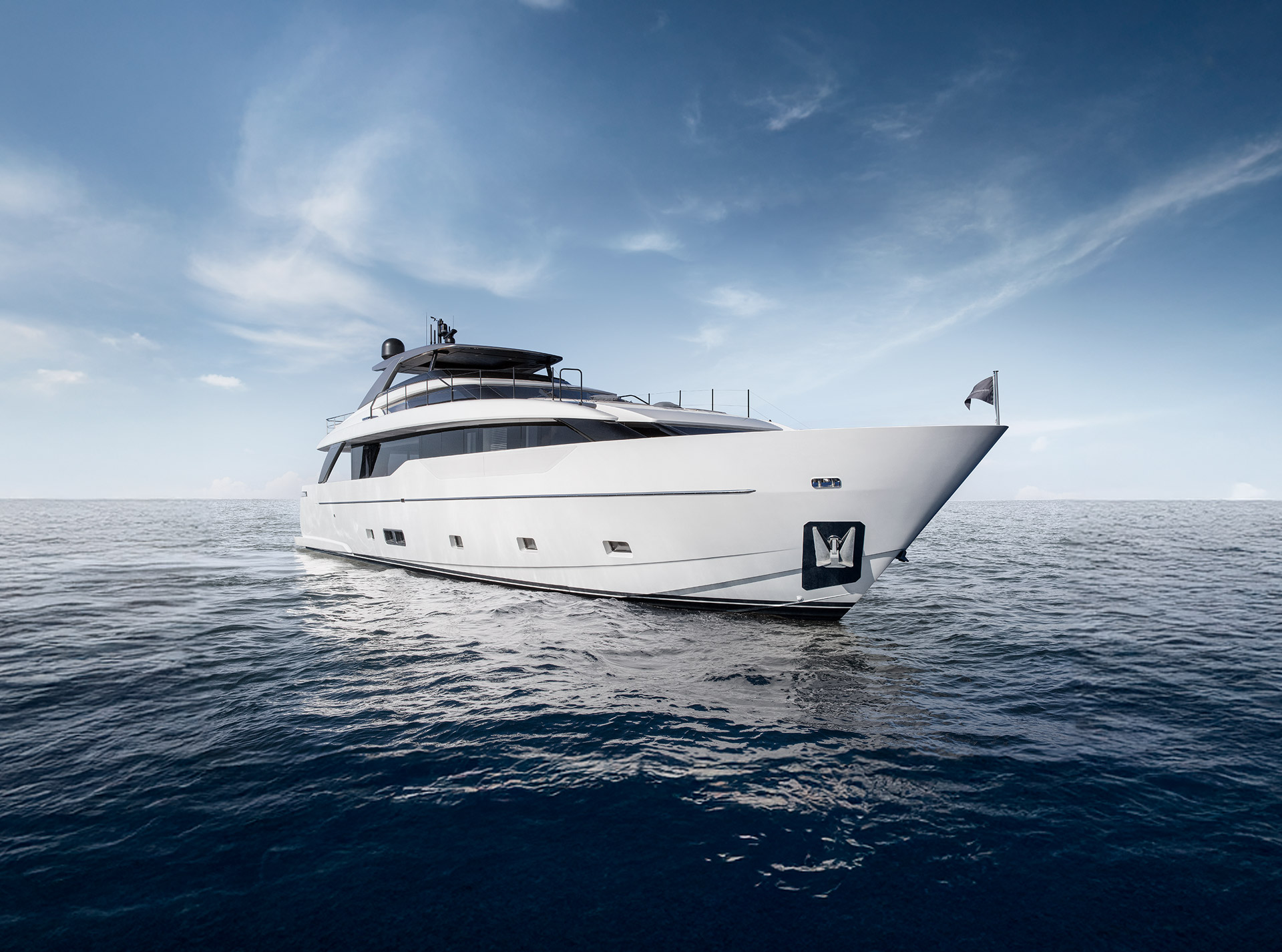 Espressione di asimmetria sapientemente interpretata attraverso linee sinuose ed eleganti. Le vetrate “One Way”, cromaticamente integrate allo scafo, smaterializzano visivamente le aperture, esaltando continuità, luminosità e una connessione diretta con il mare.