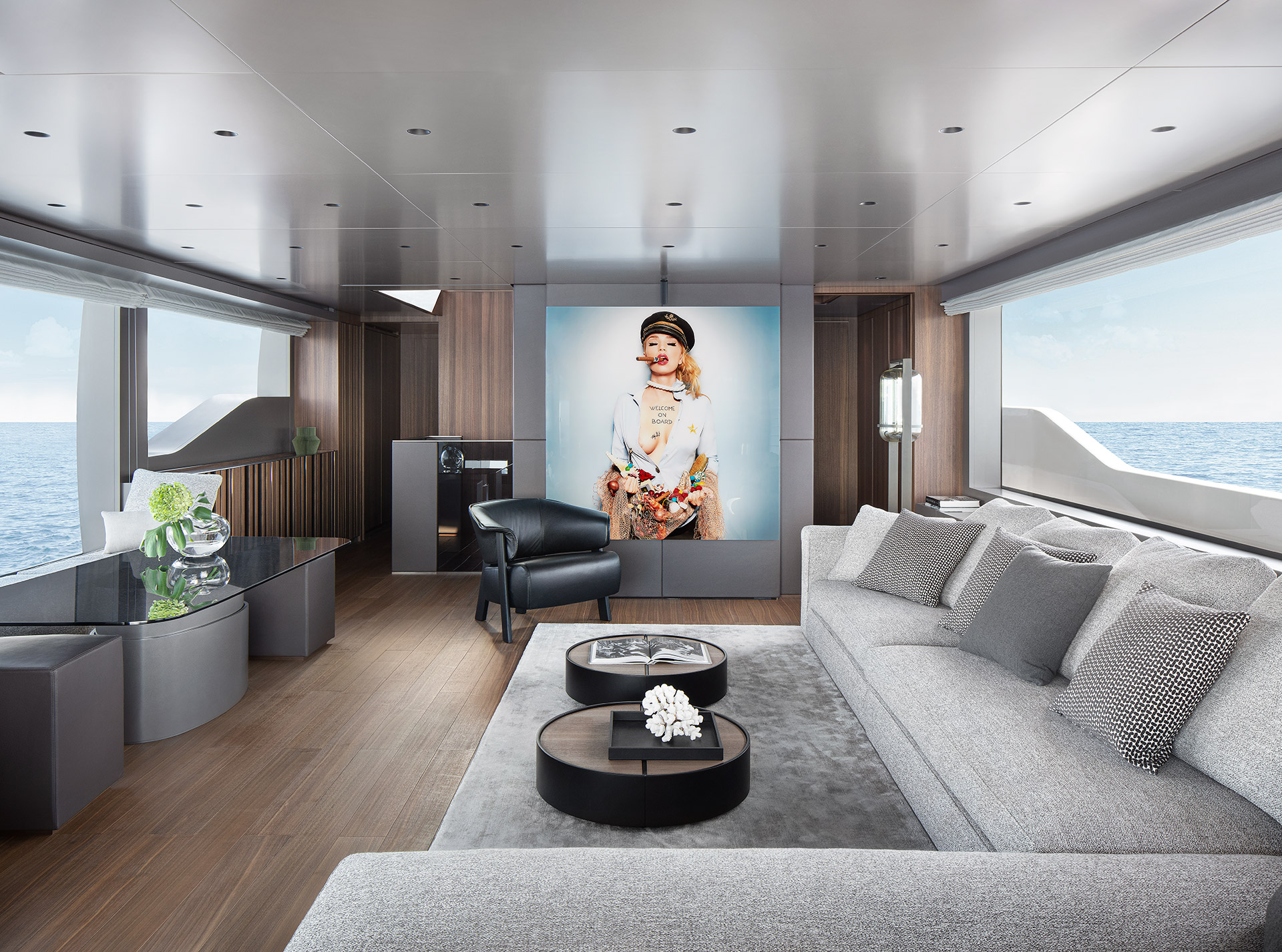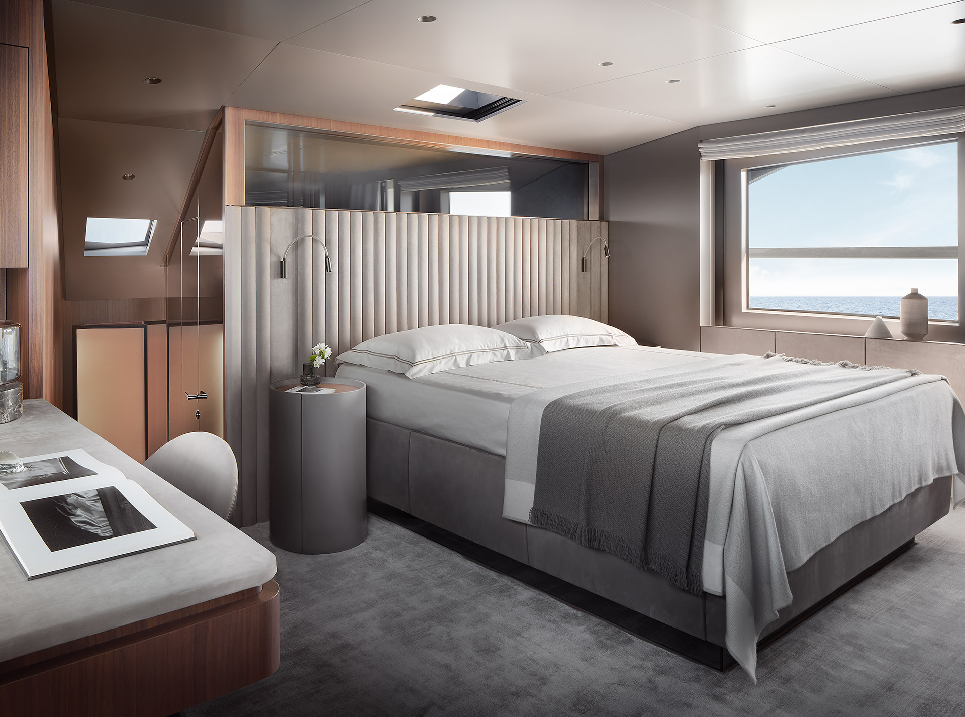 Un layout innovativo valorizza lo spazio grazie all’asimmetria, collocando salone e cabina armatoriale sullo stesso livello. Le finestre a tutta altezza aumentano la luminosità e la sensazione di apertura.