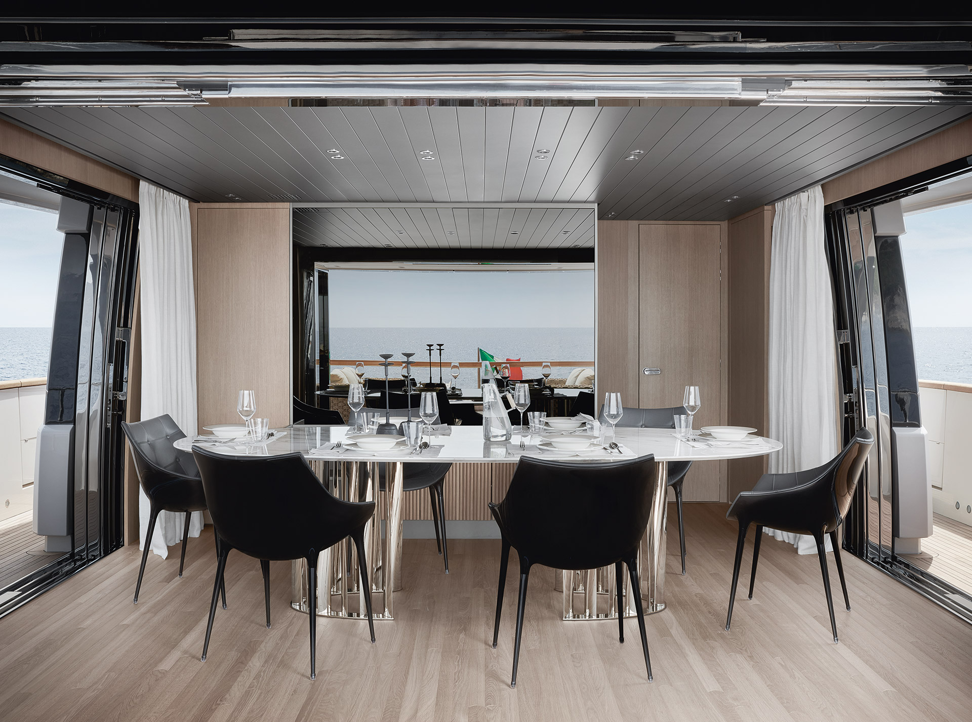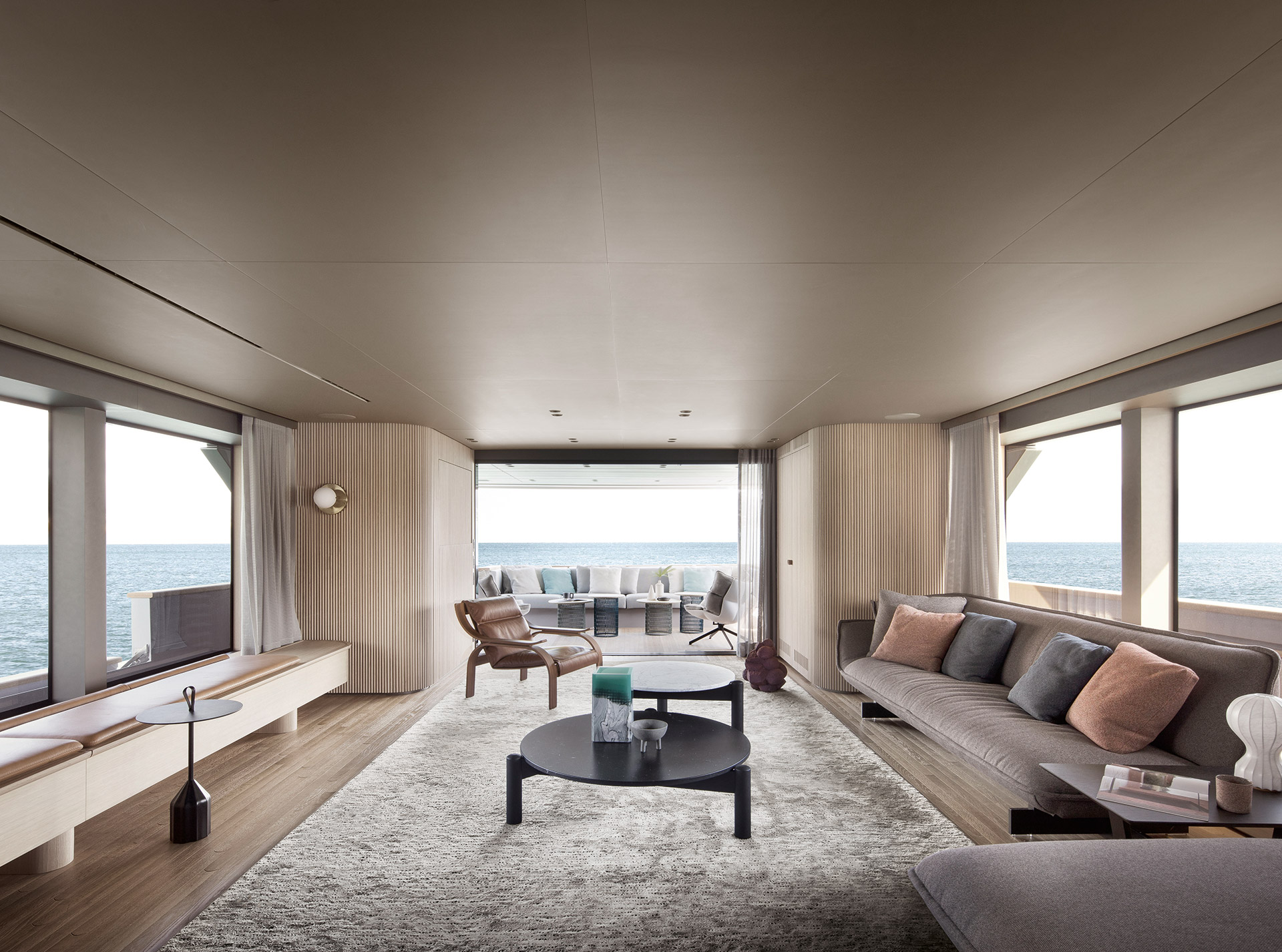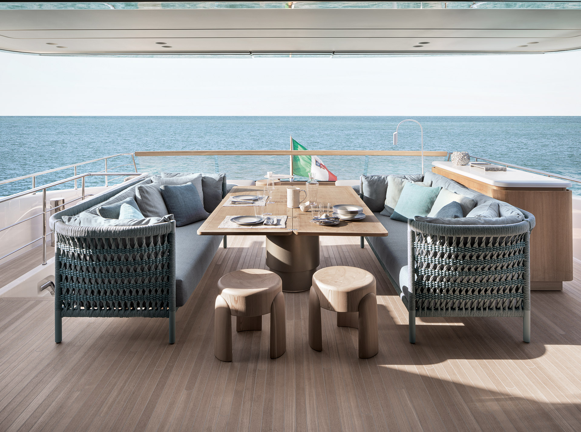 SHE reinterprets the stylistic codes of great classics of Italian yachting with a contemporary sensibility. The carefully coordinated interior design reflects this dual soul — both perpetual and modern.