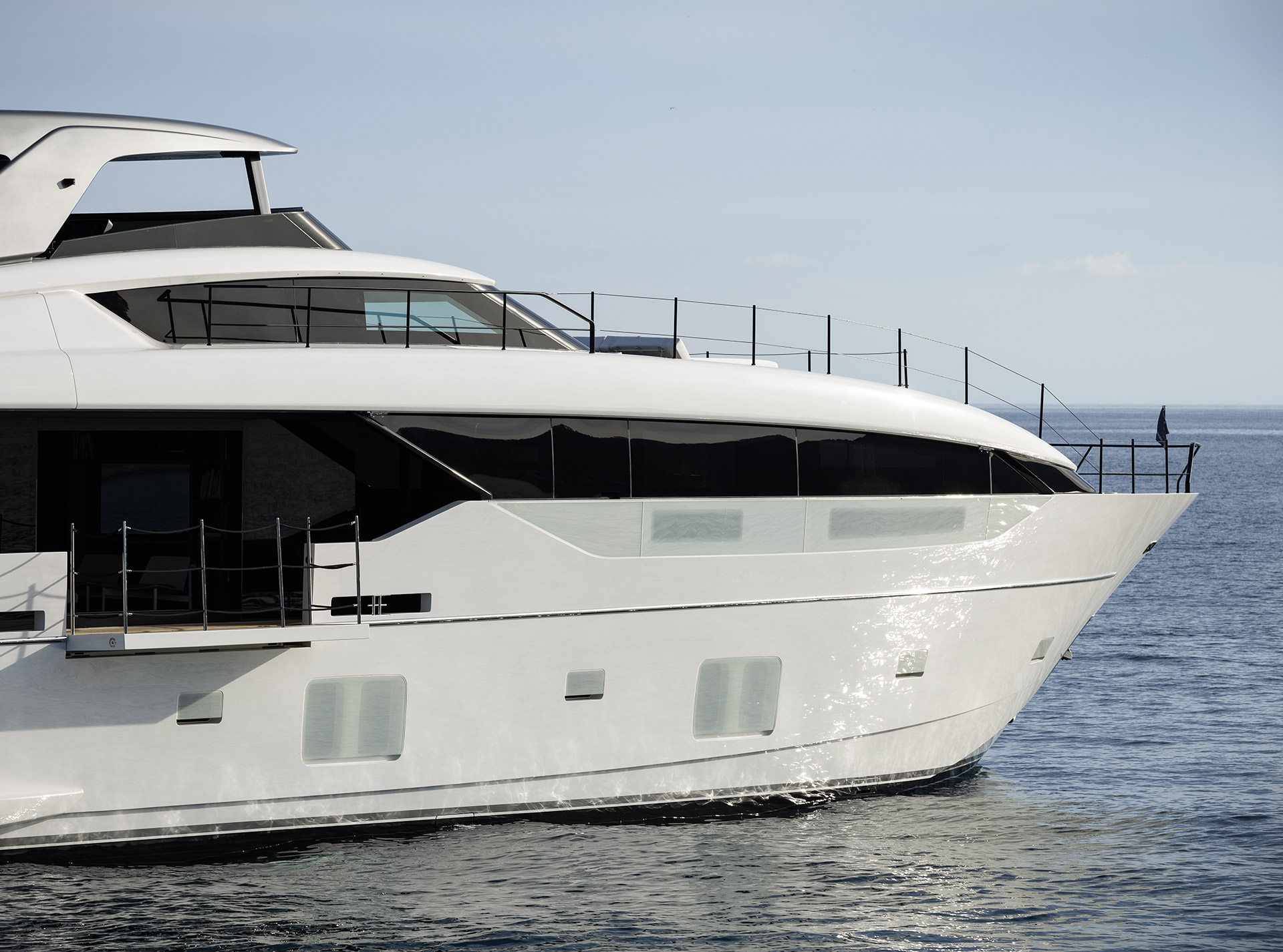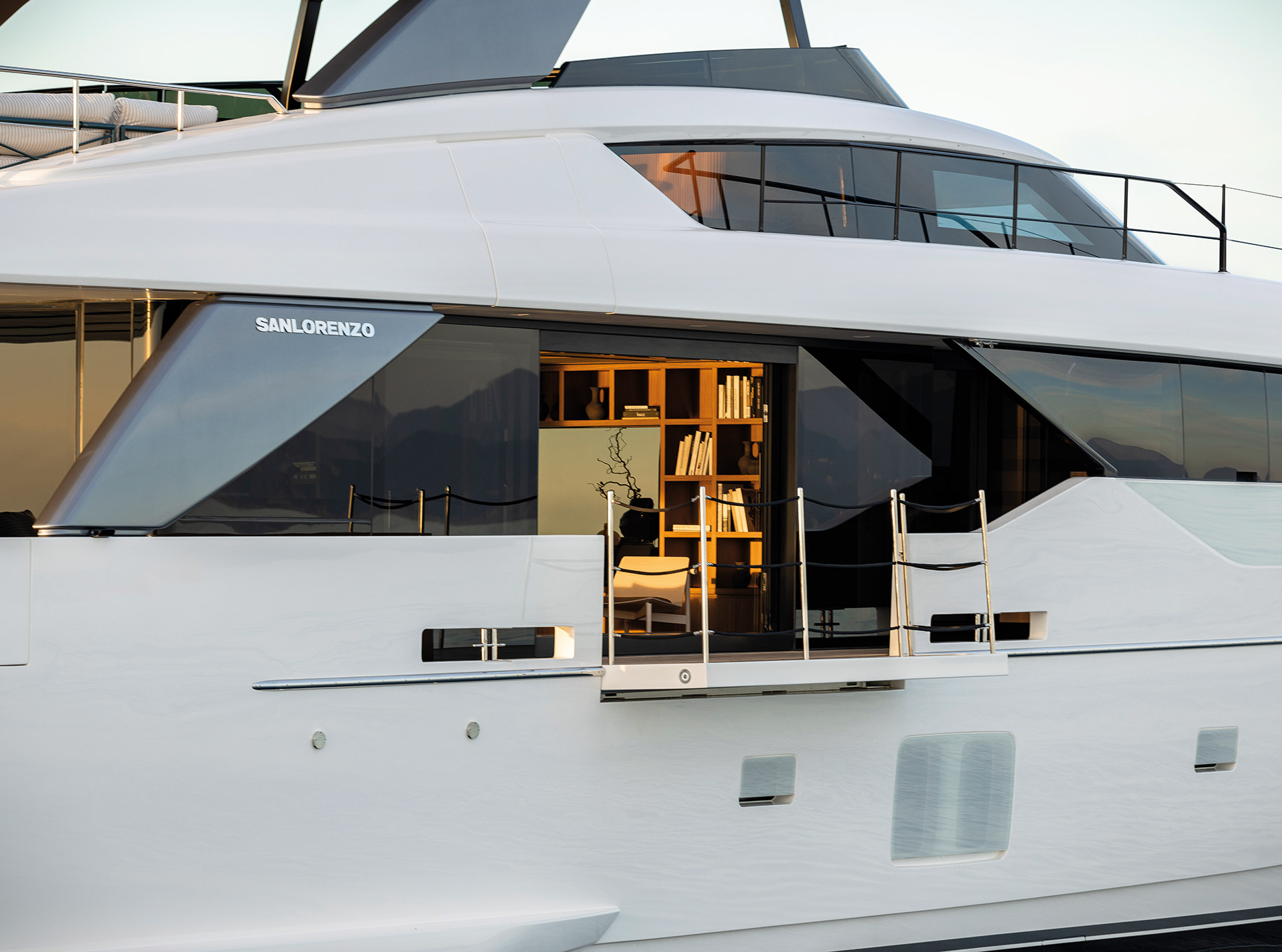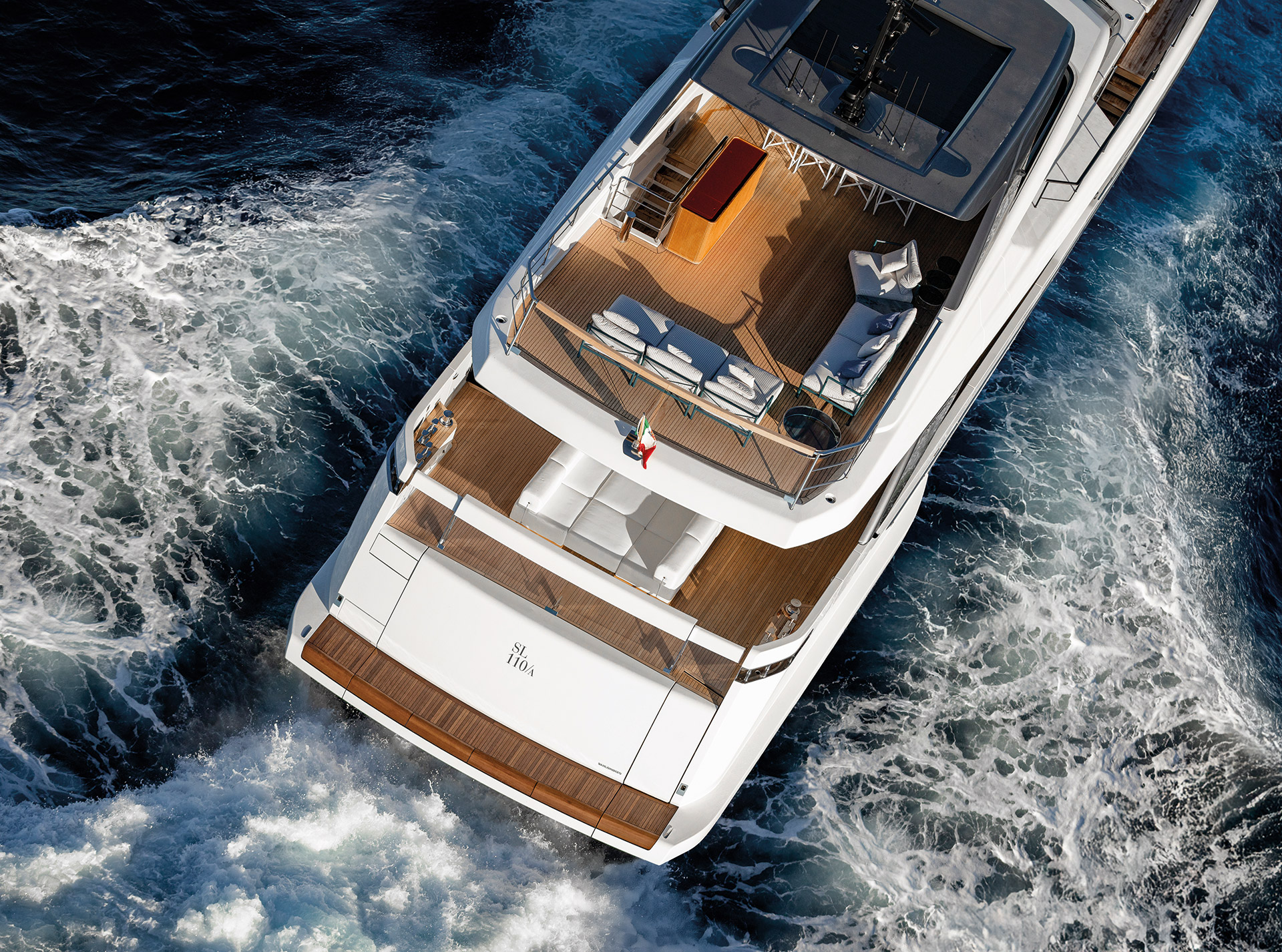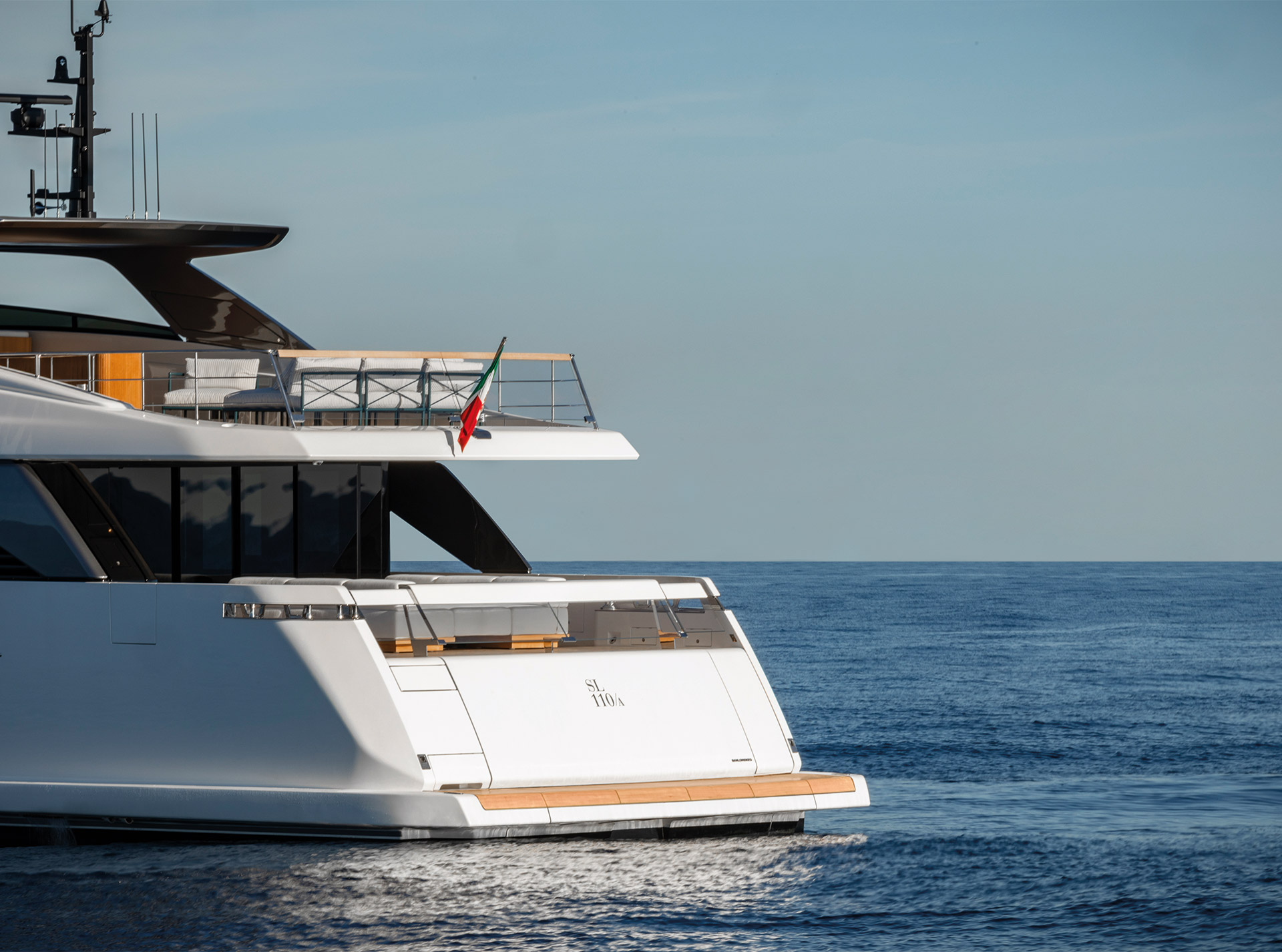 The exterior of the SL110A features sleek, modern lines and an asymmetric layout that opens the yacht to the sea, offering generous terraces, unobstructed views, and a refined sense of openness.