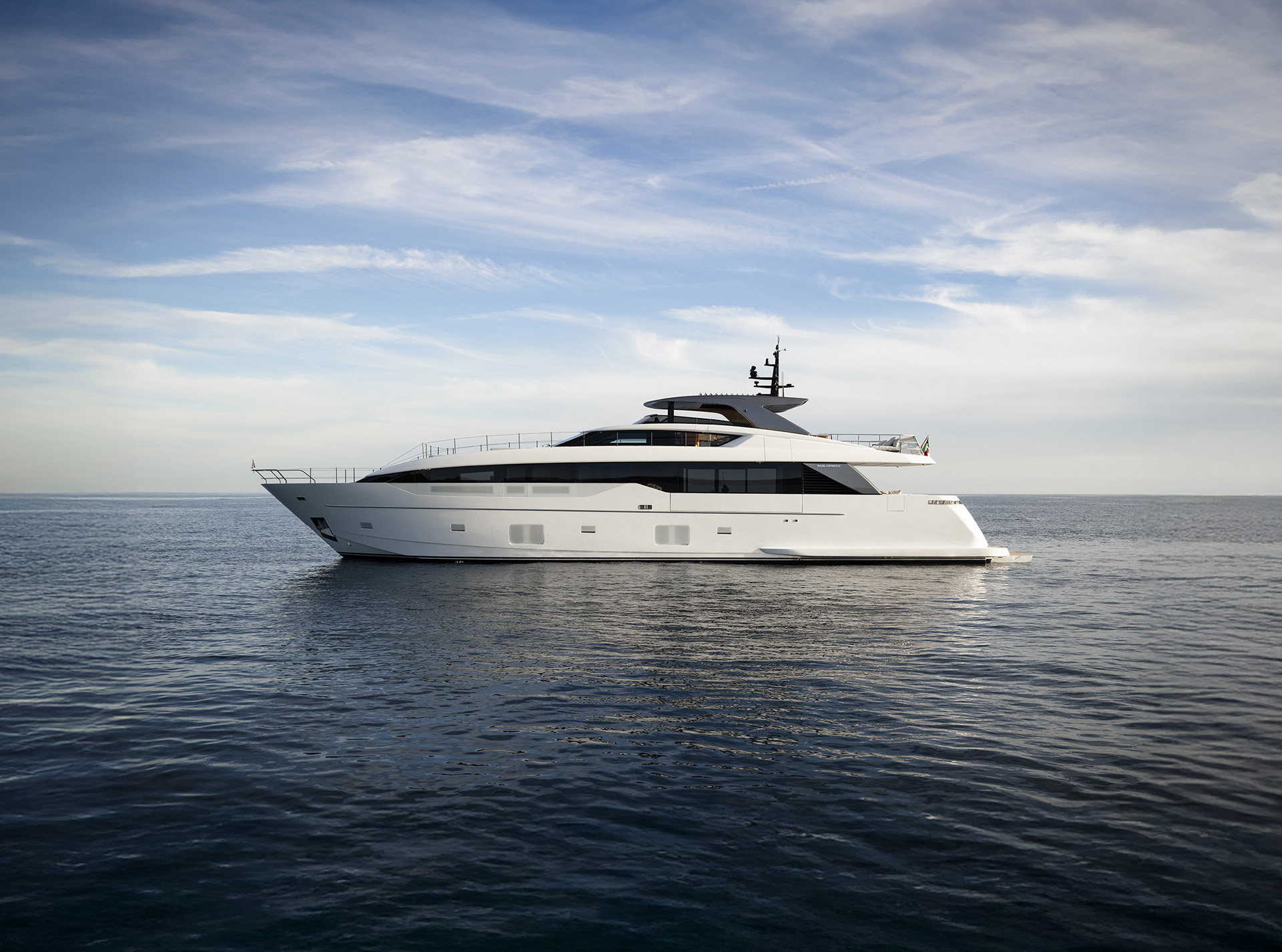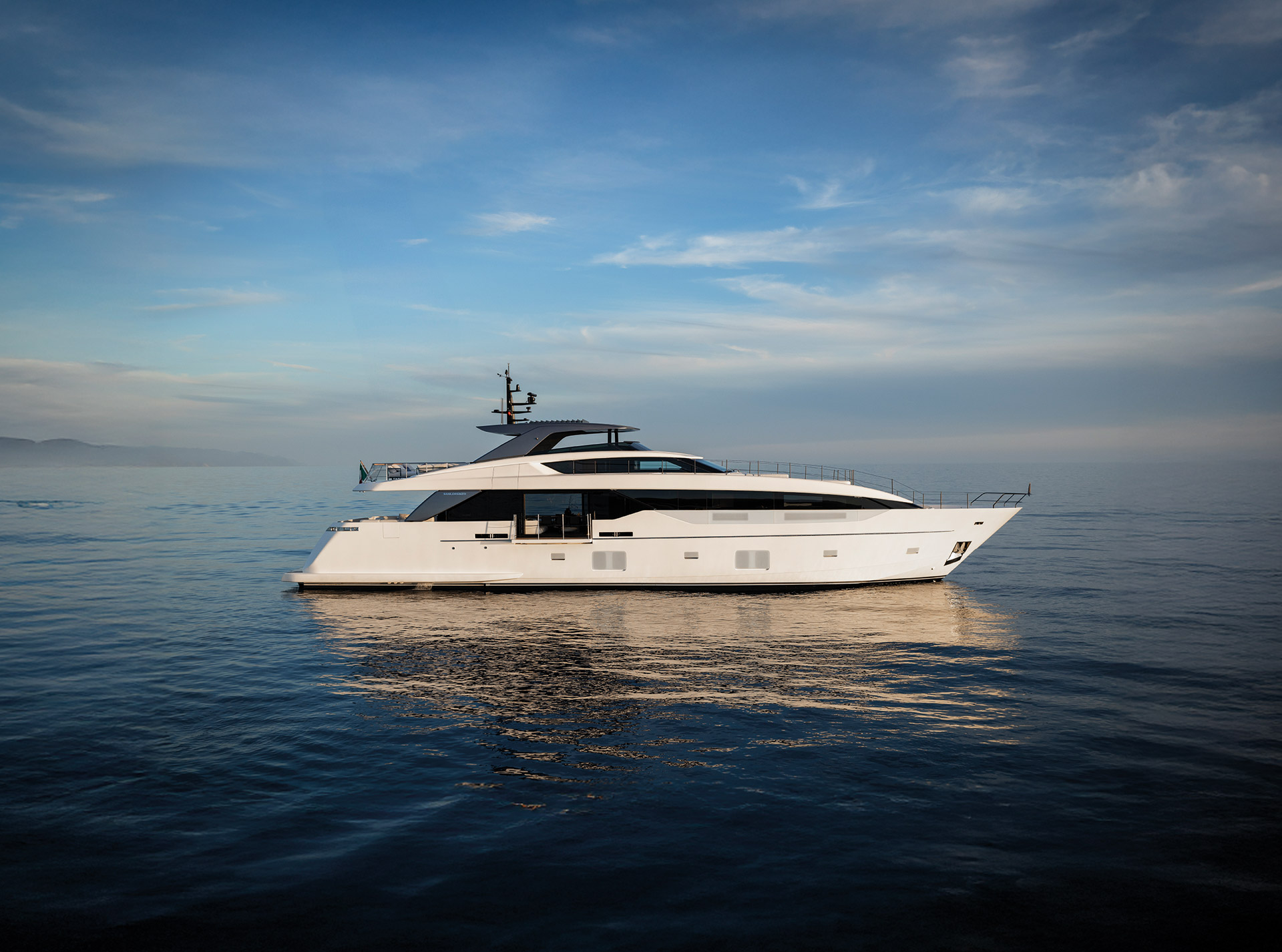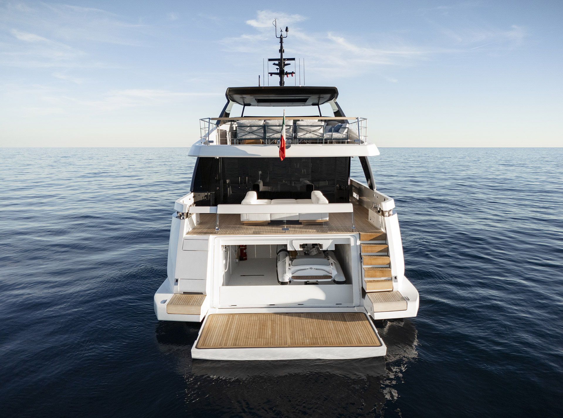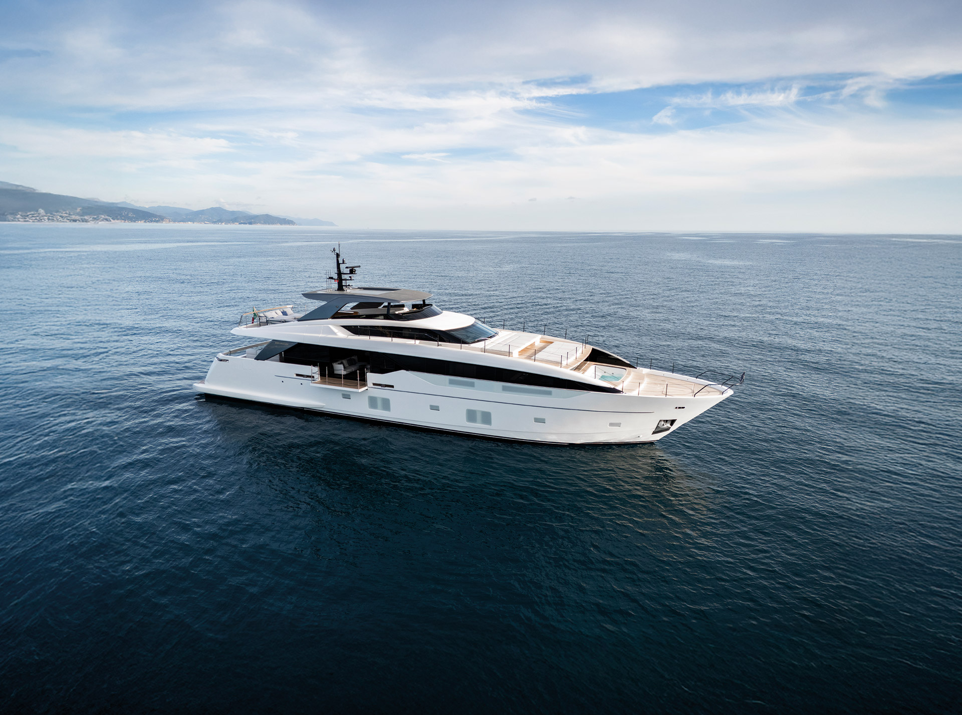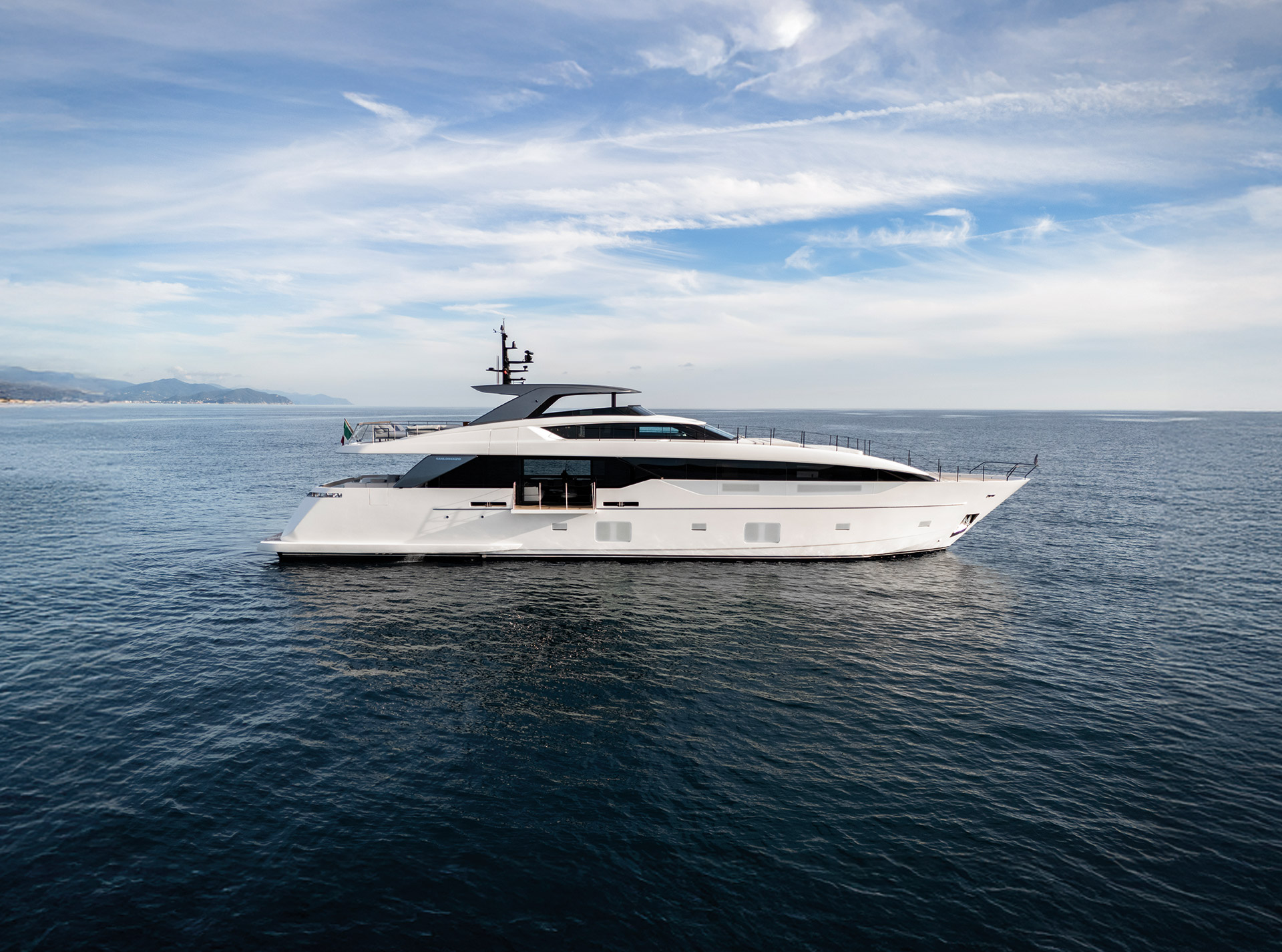 The exterior of the SL110A features sleek, modern lines and an asymmetric layout that opens the yacht to the sea, offering generous terraces, unobstructed views, and a refined sense of openness.