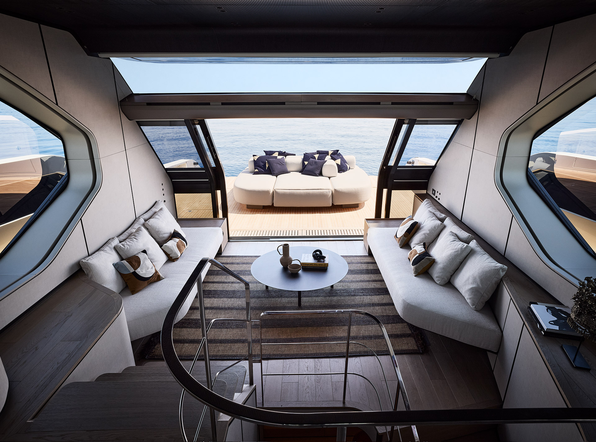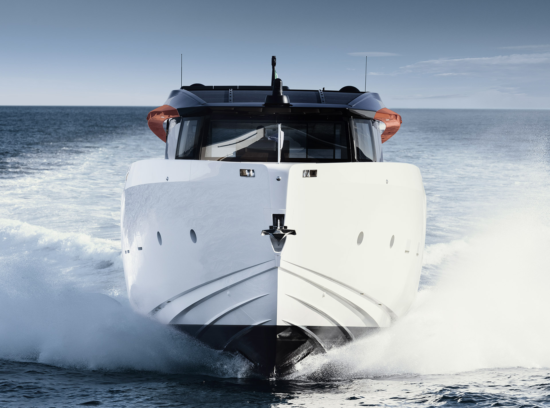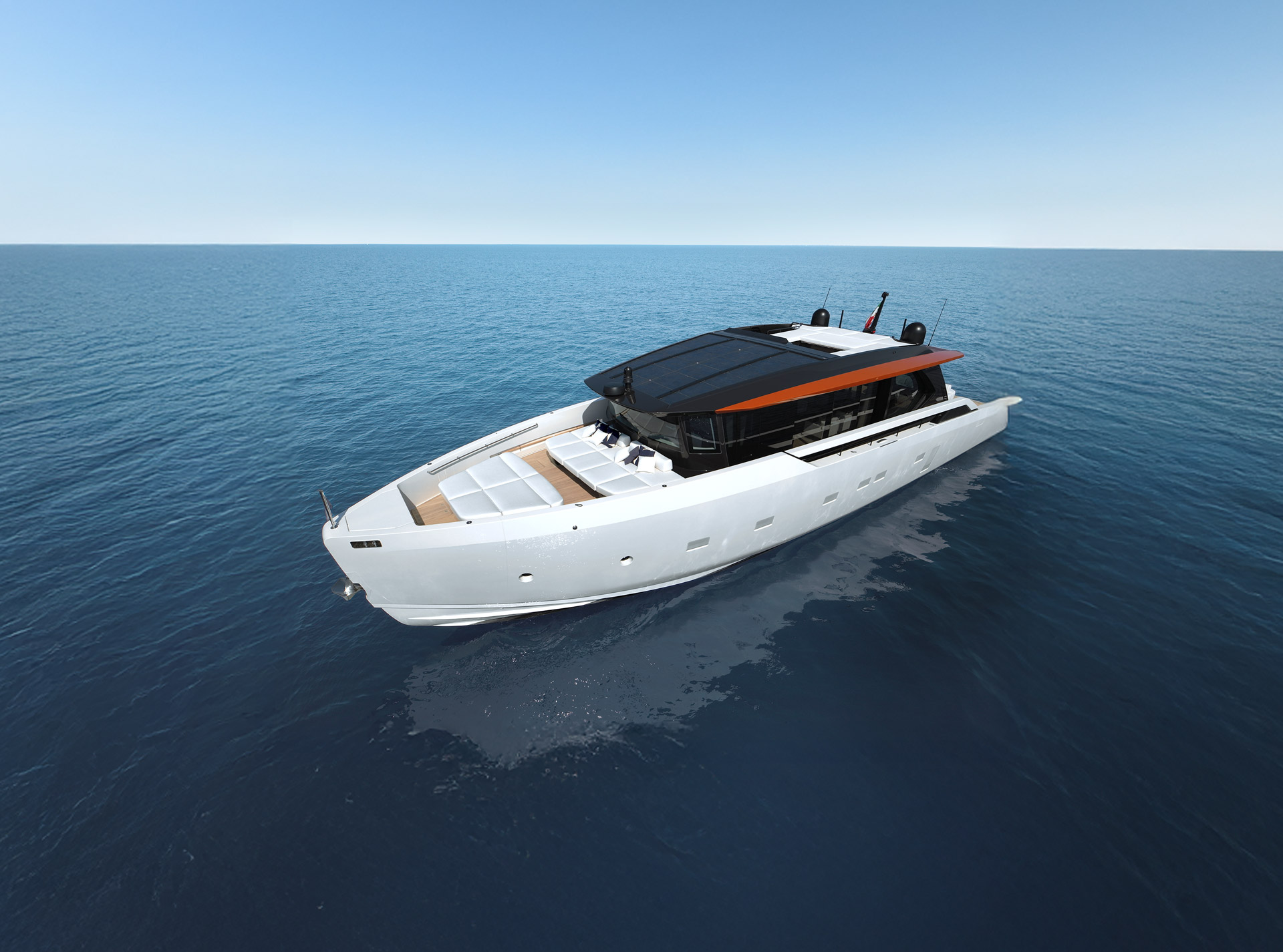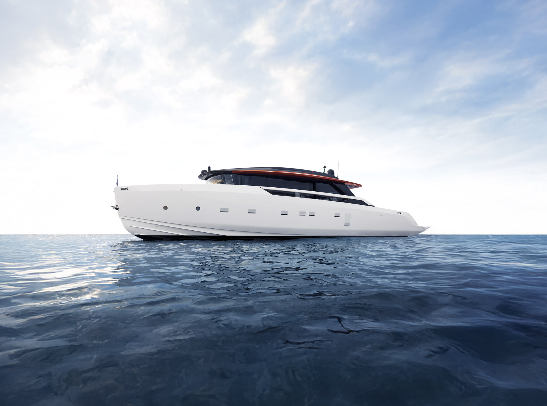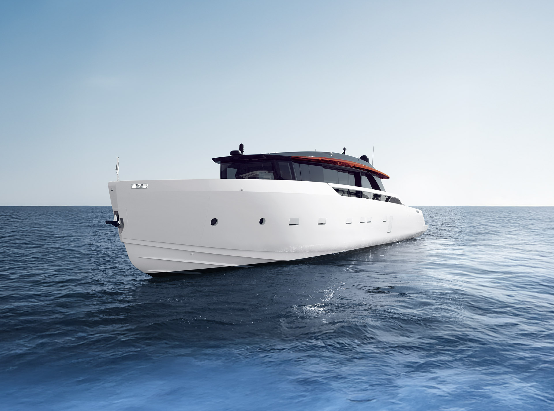 Clean, minimalist lines define the SP92 exterior, where sportiness meets balance. The extended copper blade, expansive glazing and low beach area create a sleek profile, enhancing light, openness and a seamless bond with the sea.