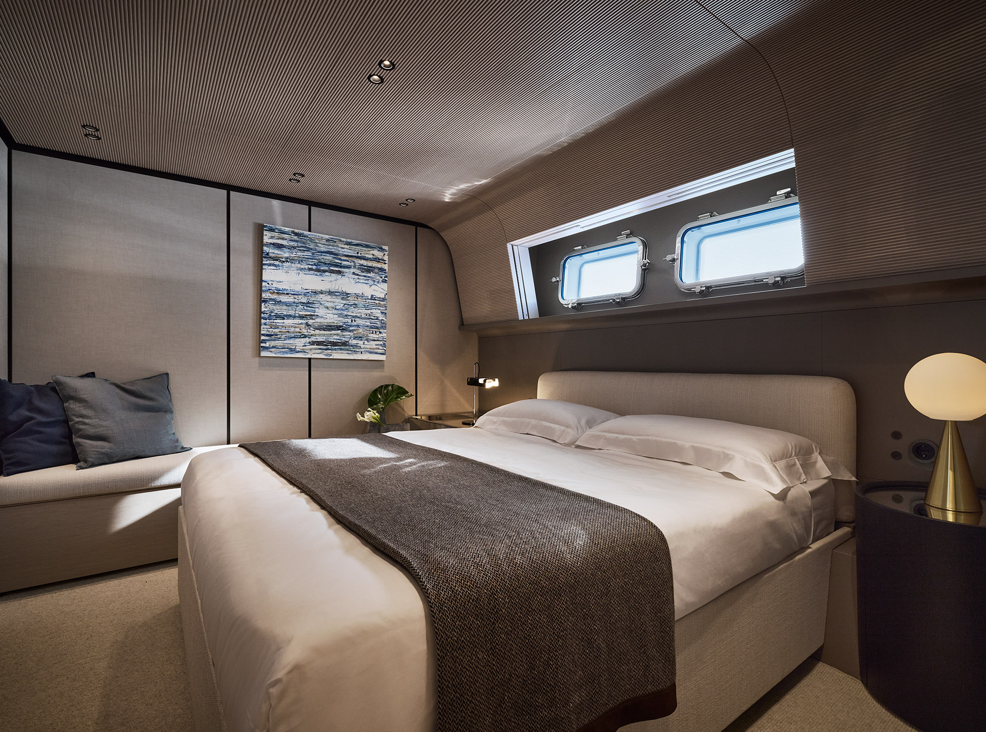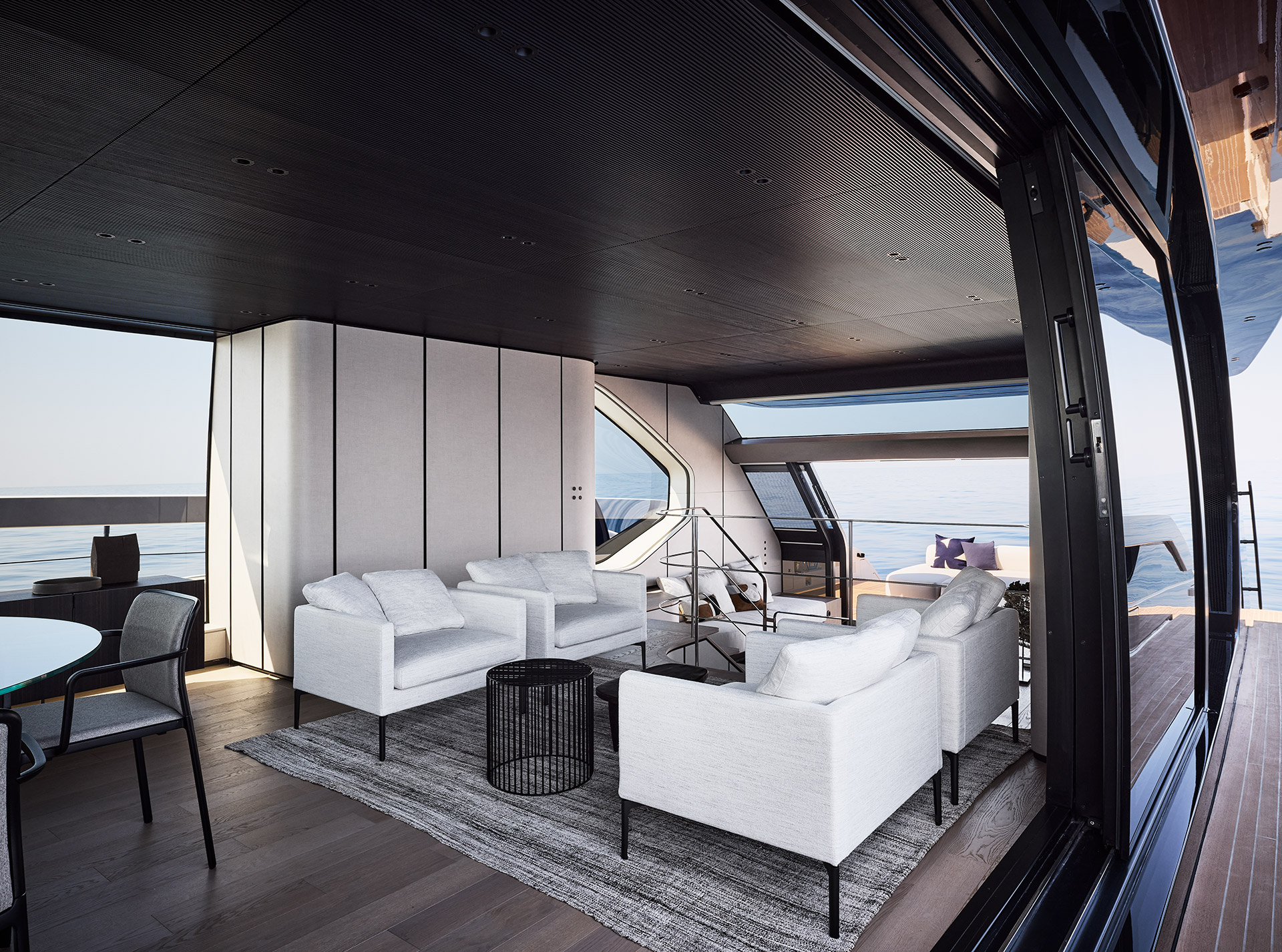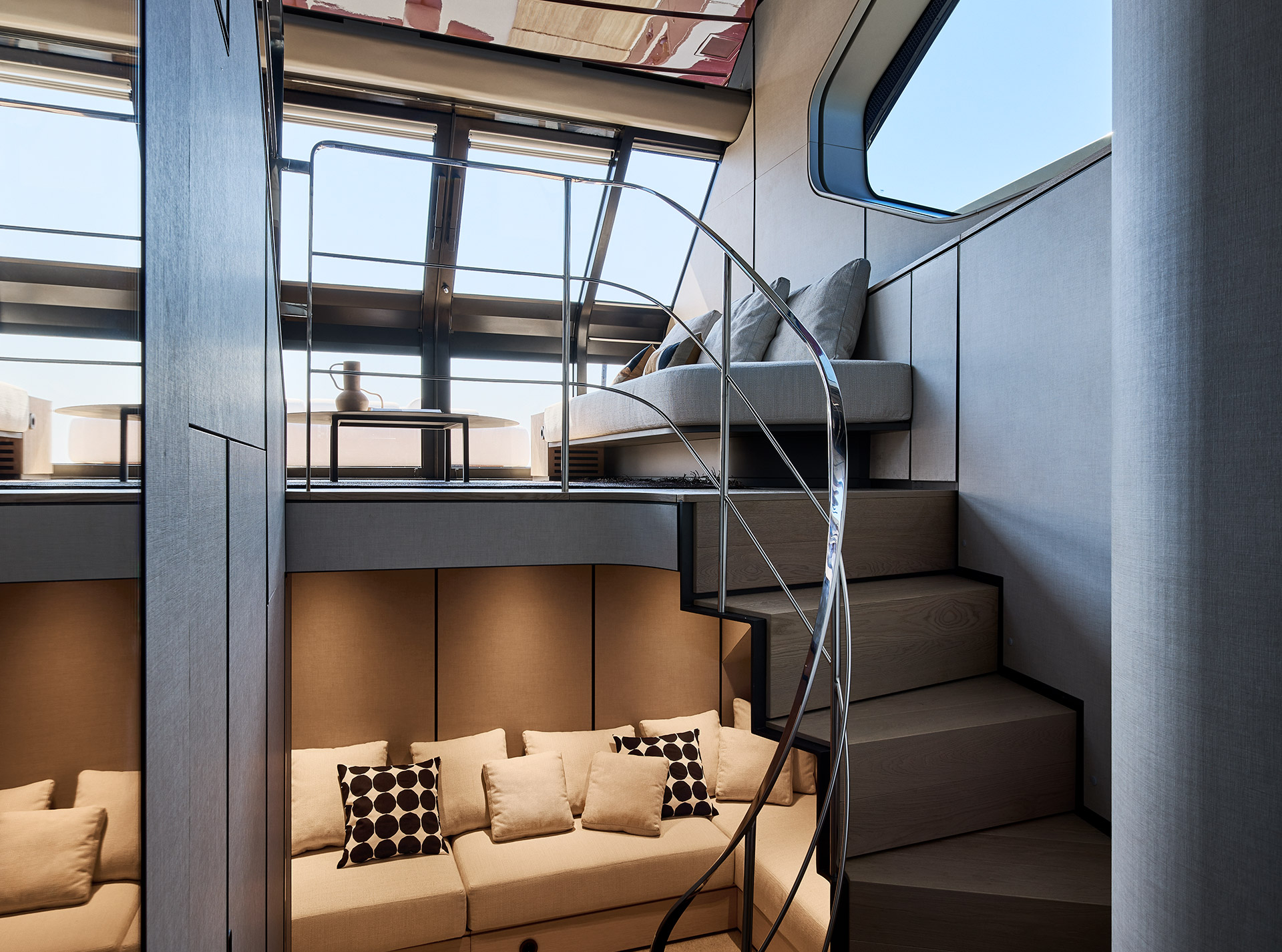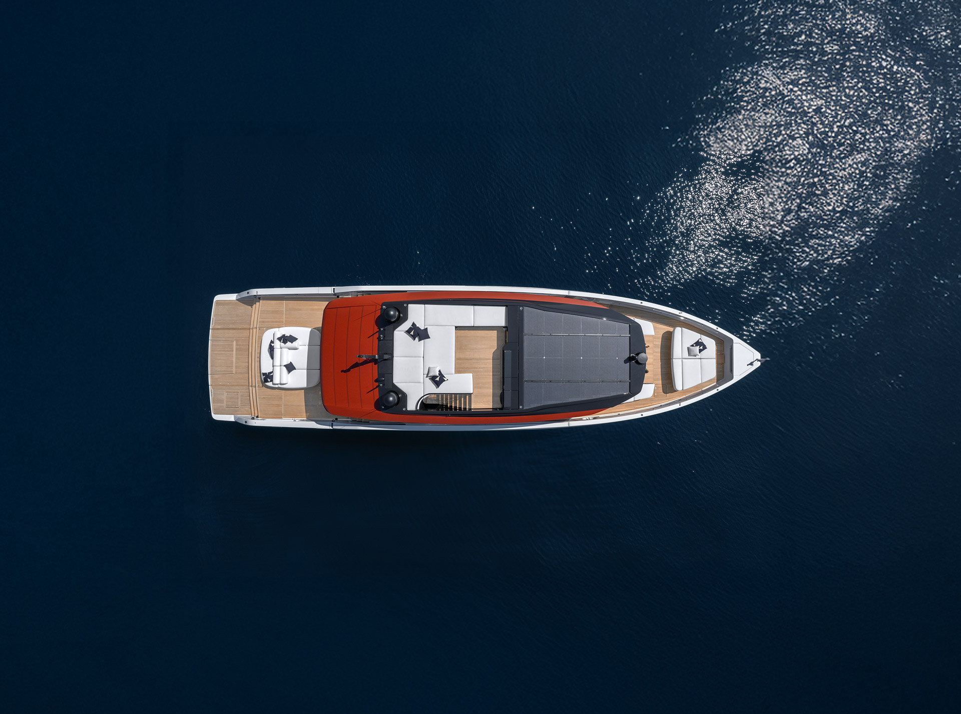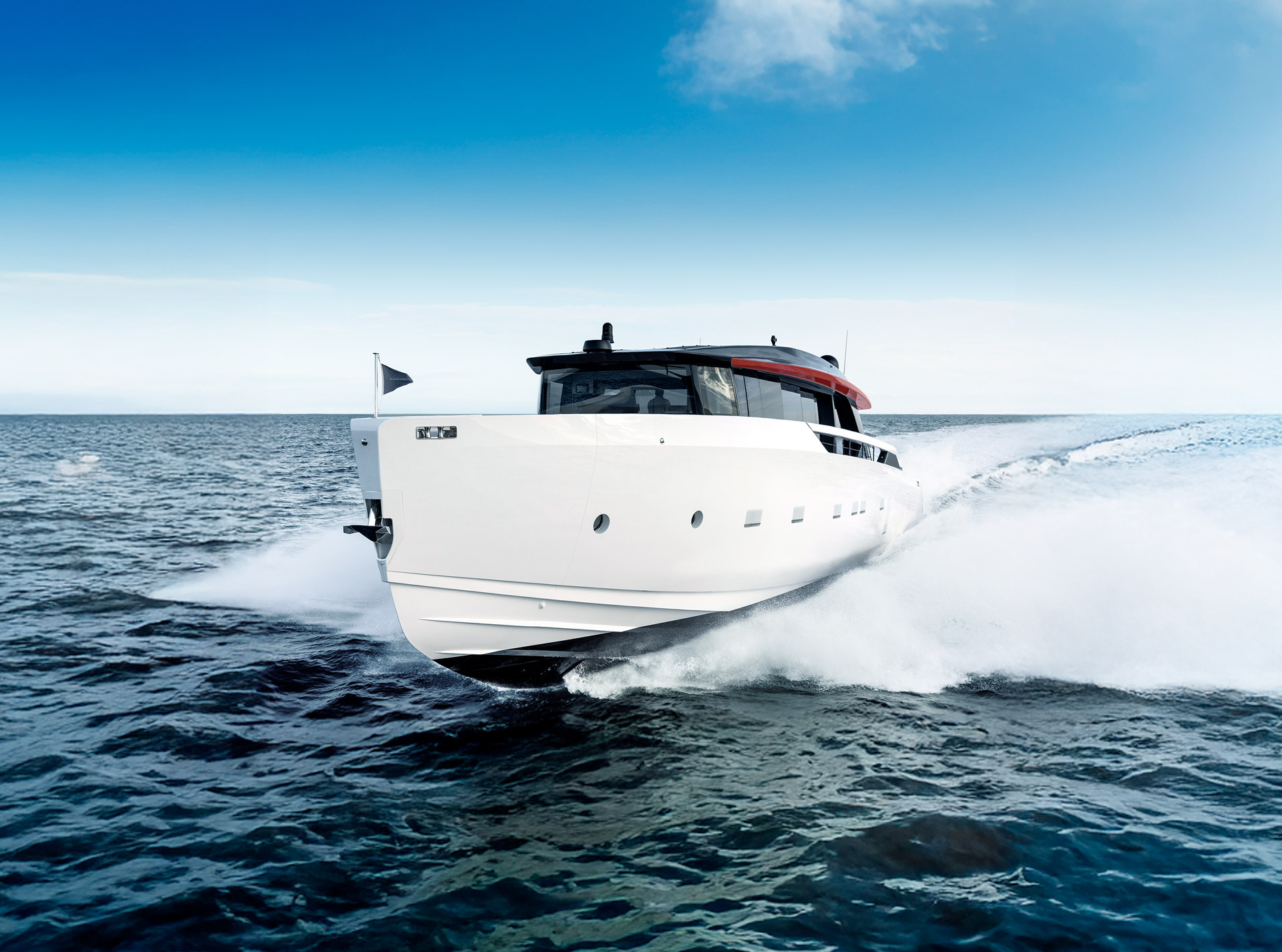 Clean, minimalist lines define the SP92 exterior, where sportiness meets balance. The extended copper blade, expansive glazing and low beach area create a sleek profile, enhancing light, openness and a seamless bond with the sea.