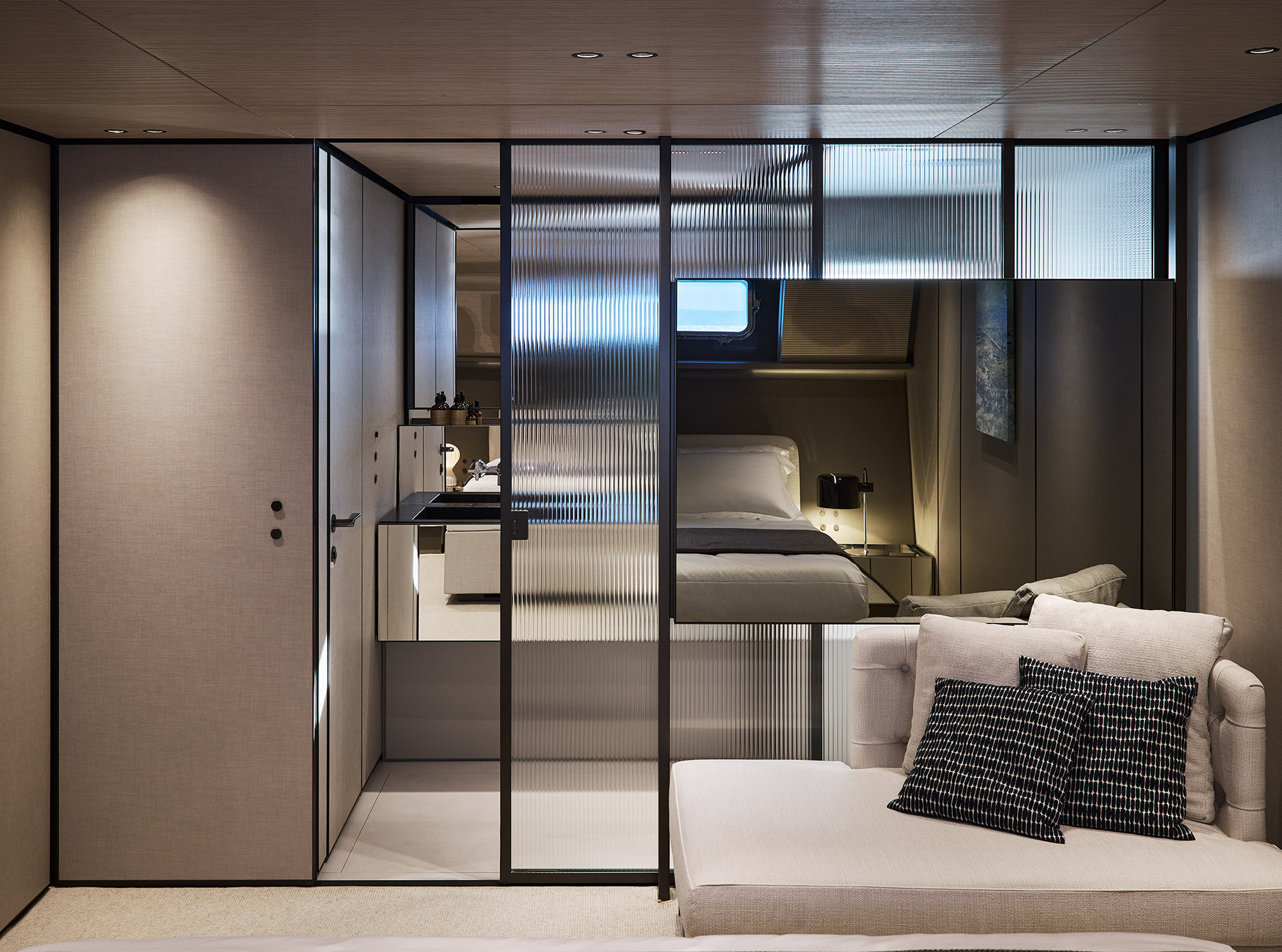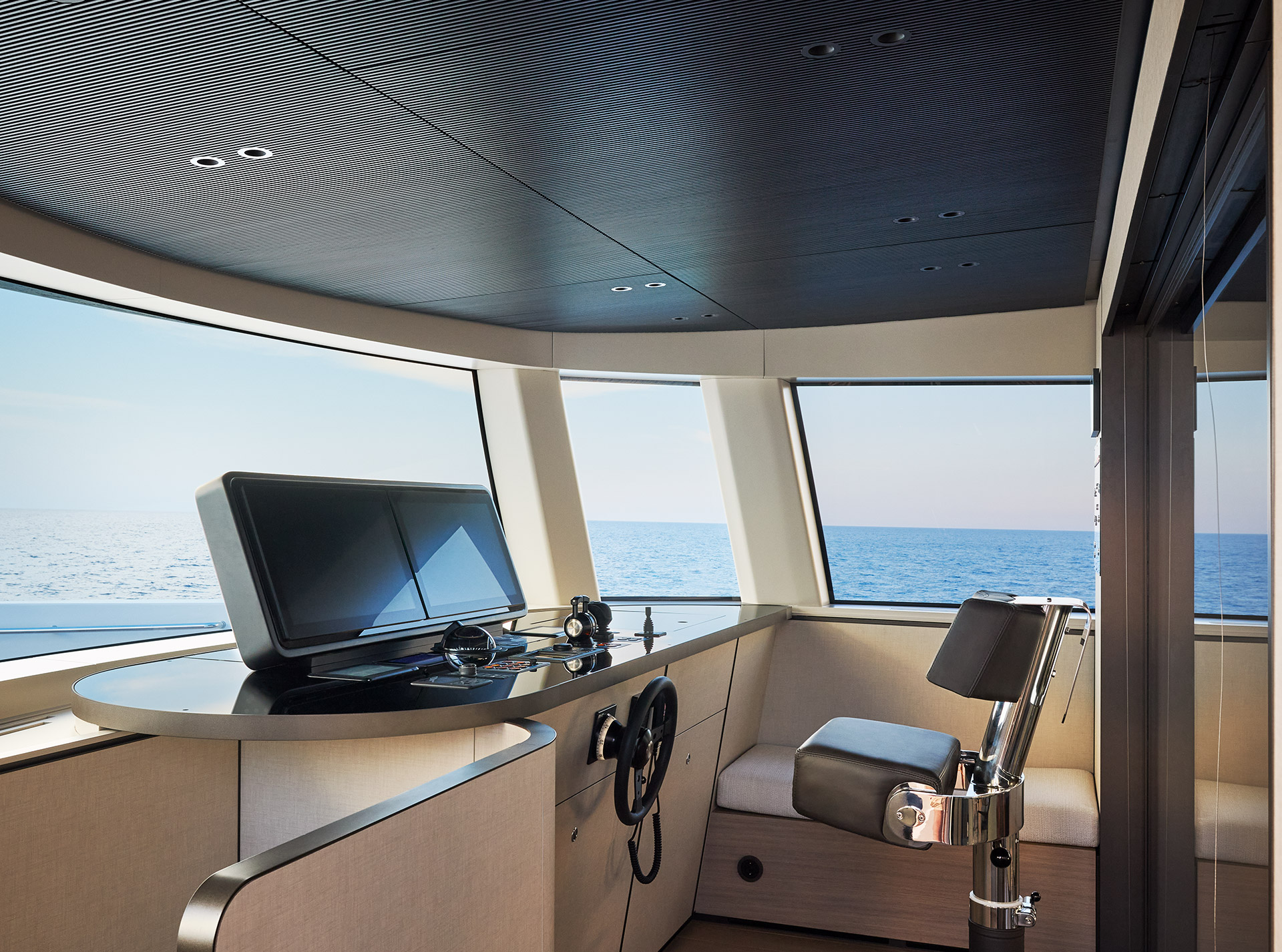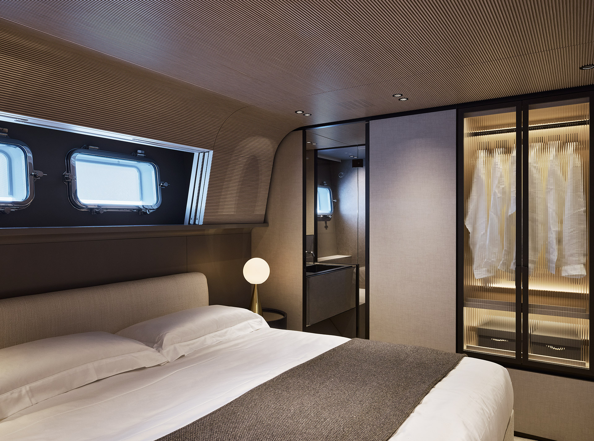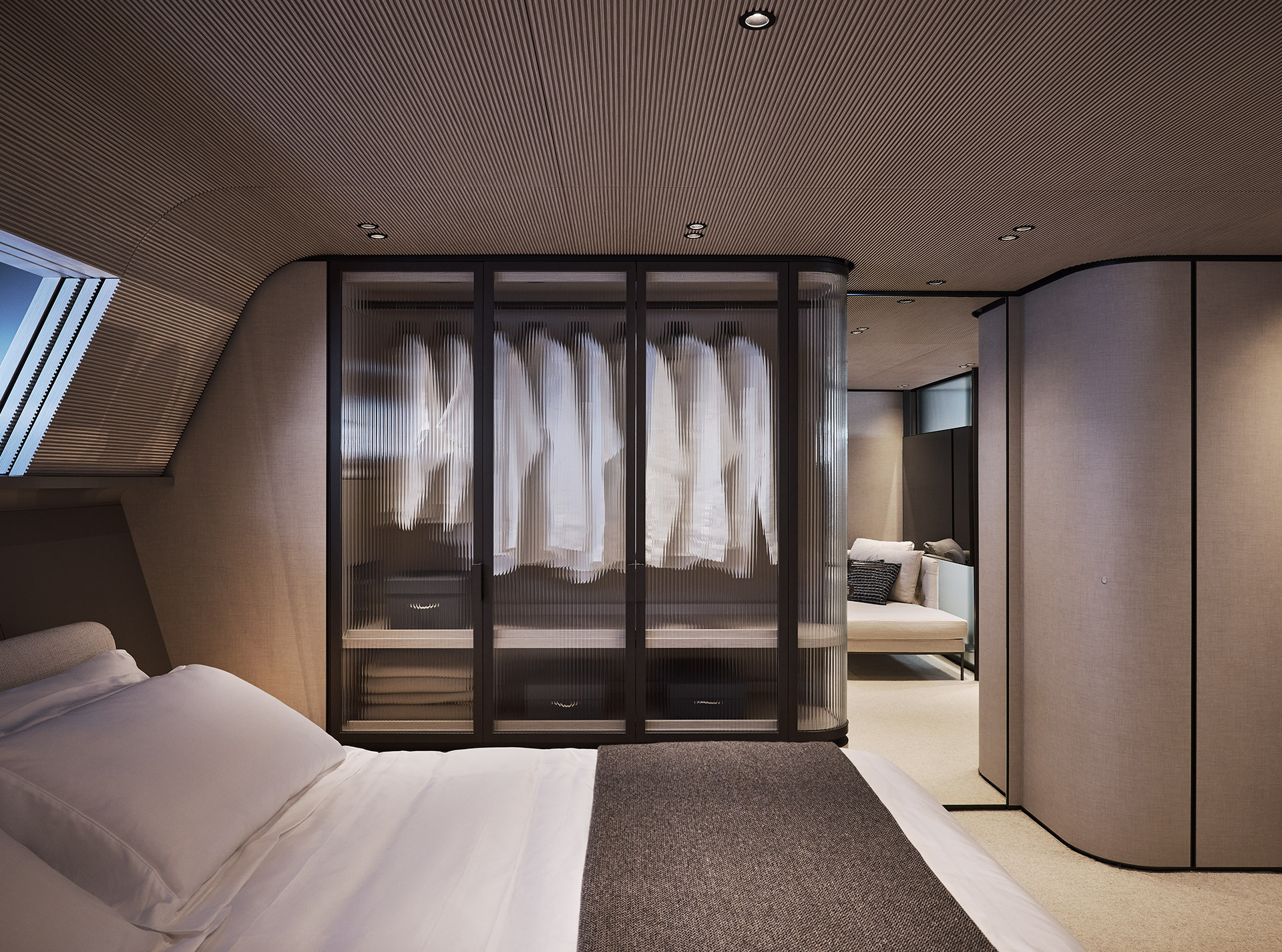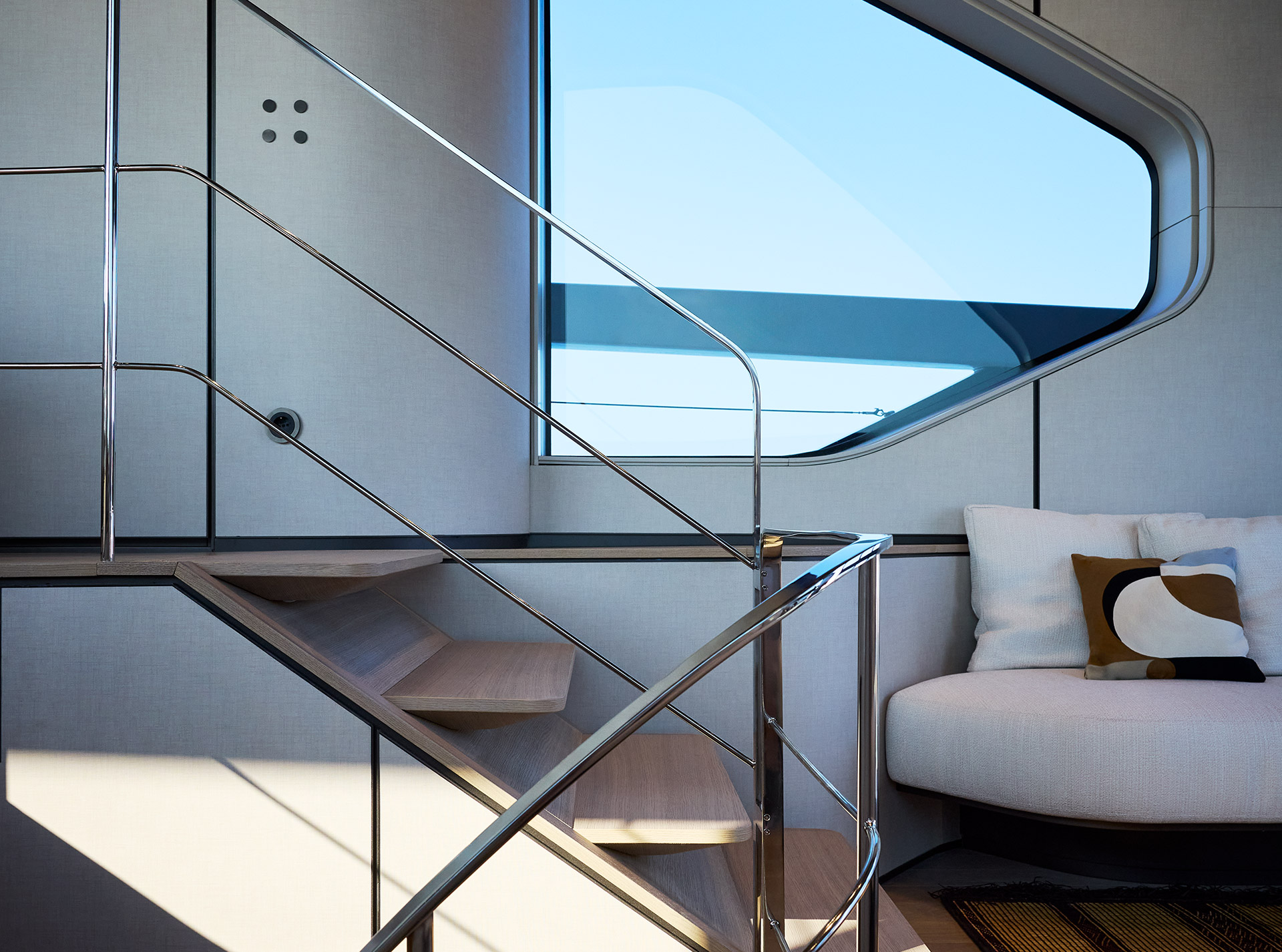 Clean, minimalist lines define the SP92 exterior, where sportiness meets balance. The extended copper blade, expansive glazing and low beach area create a sleek profile, enhancing light, openness and a seamless bond with the sea.