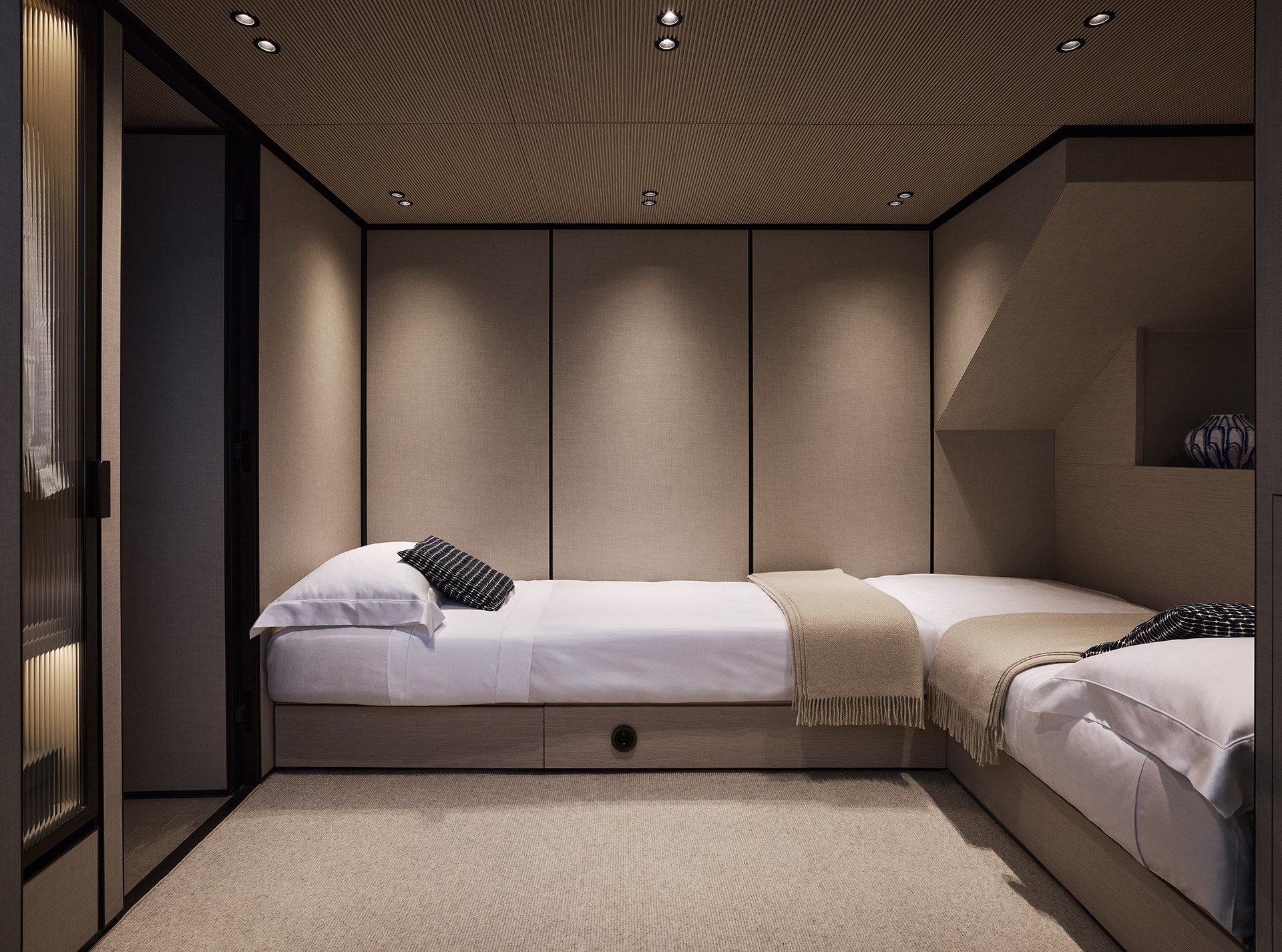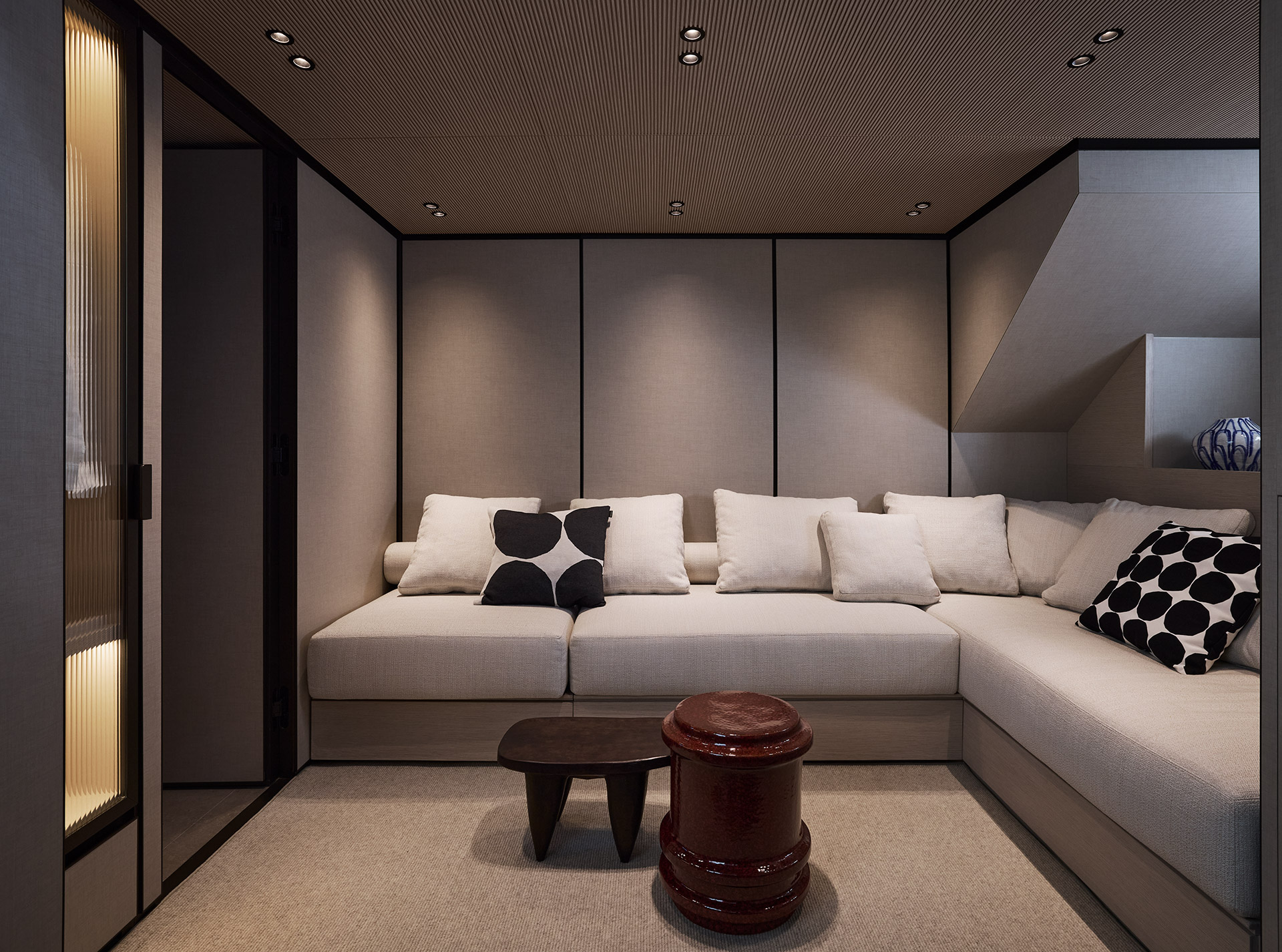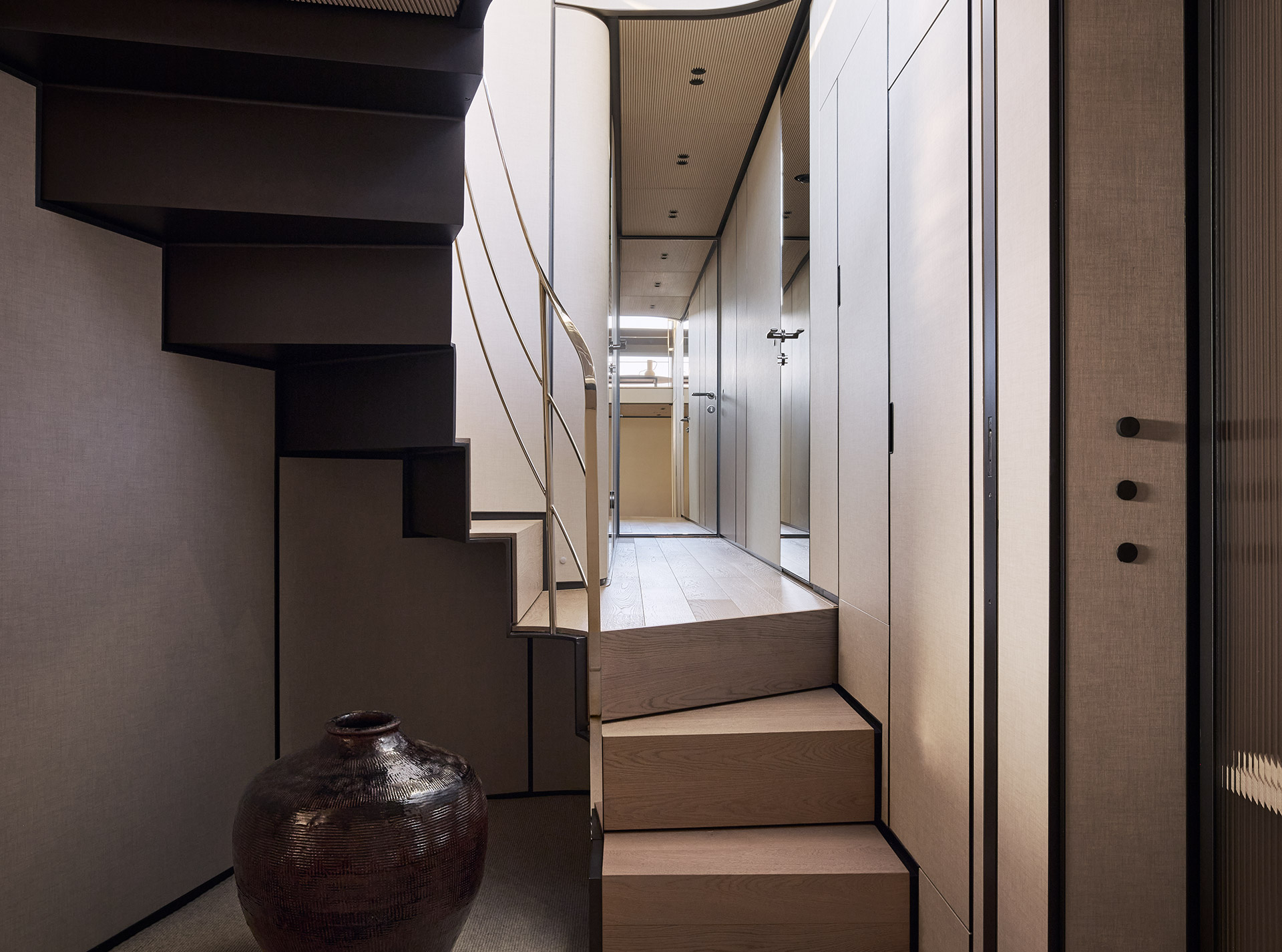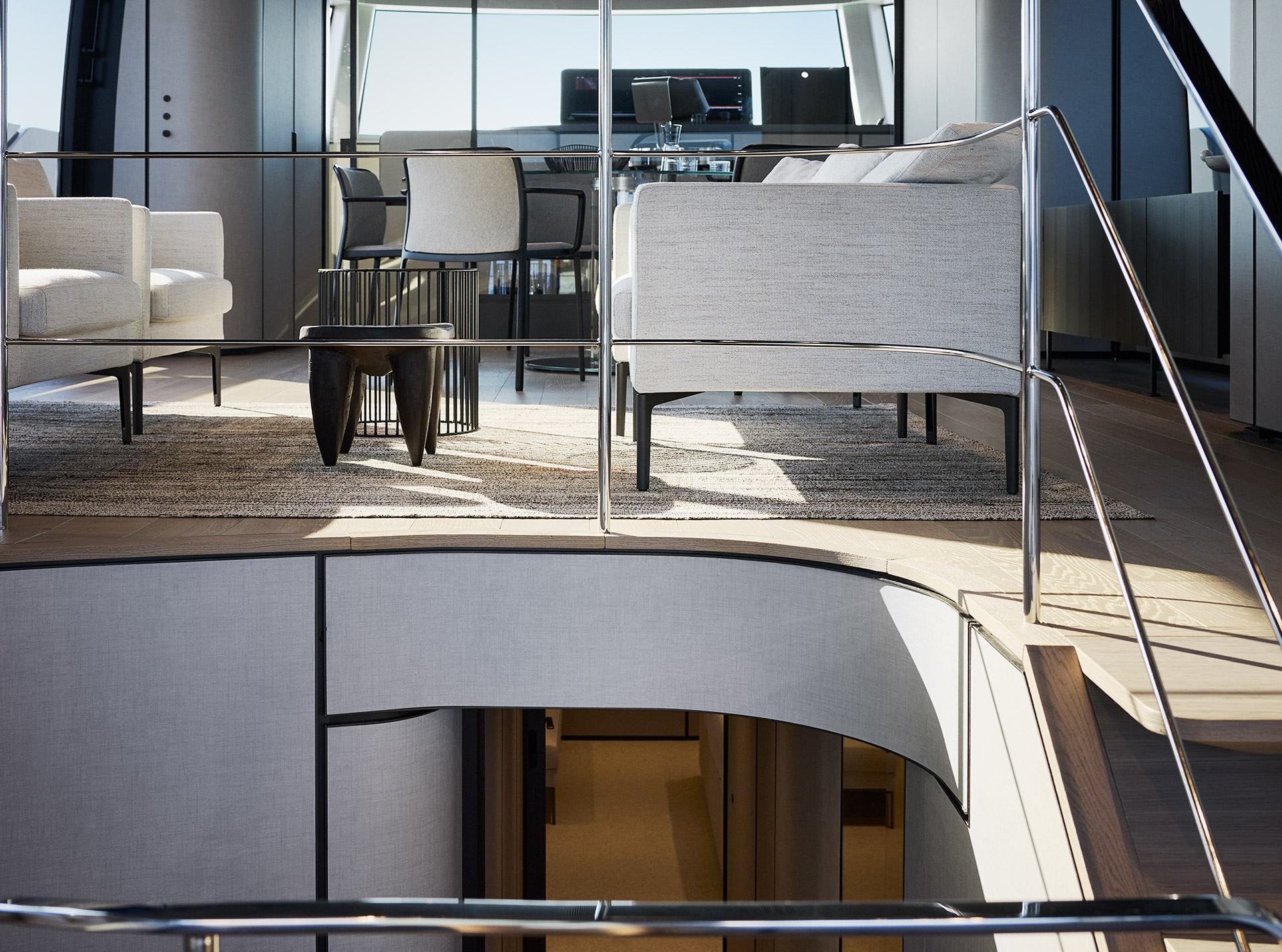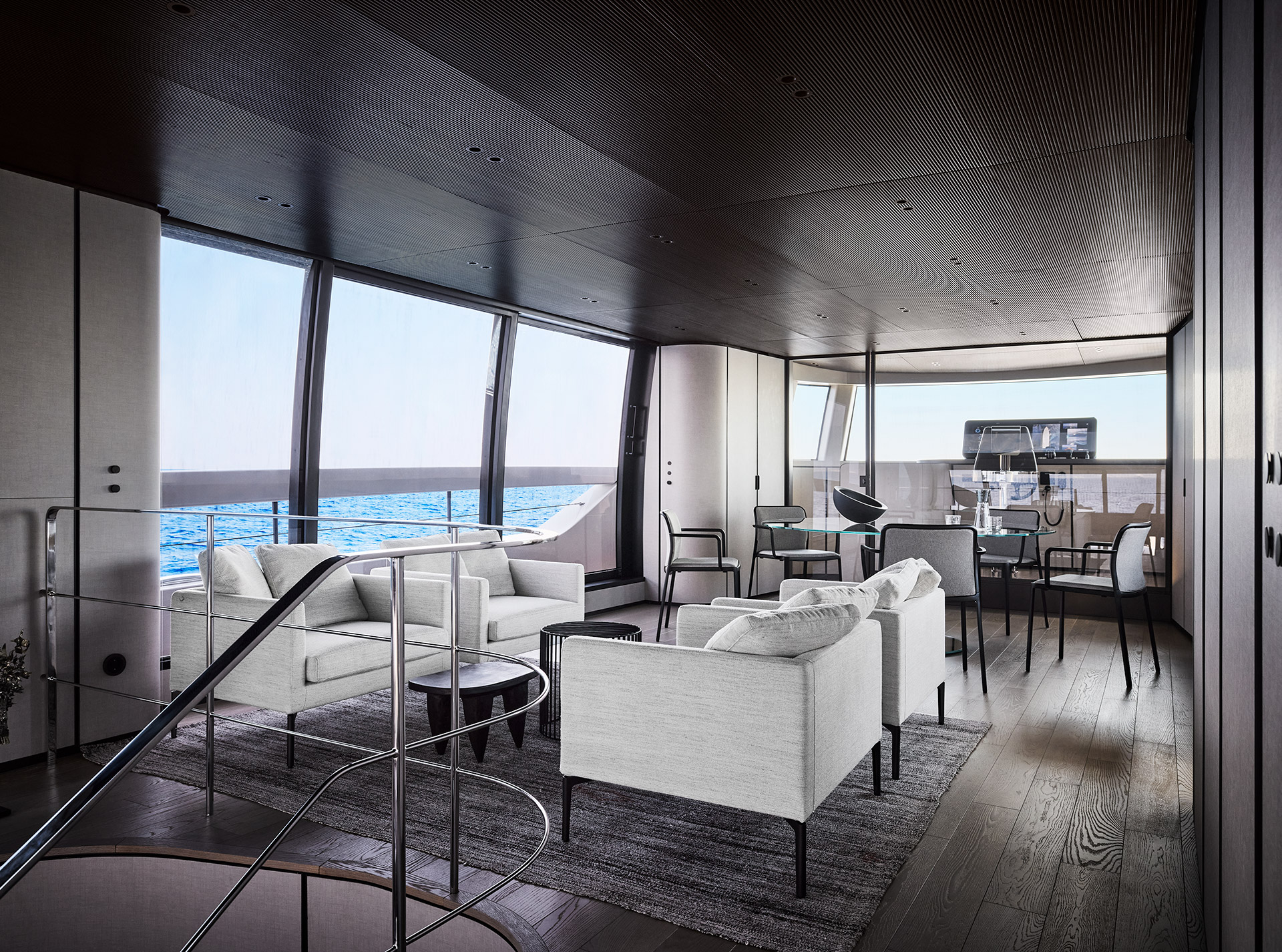 Clean, minimalist lines define the SP92 exterior, where sportiness meets balance. The extended copper blade, expansive glazing and low beach area create a sleek profile, enhancing light, openness and a seamless bond with the sea.