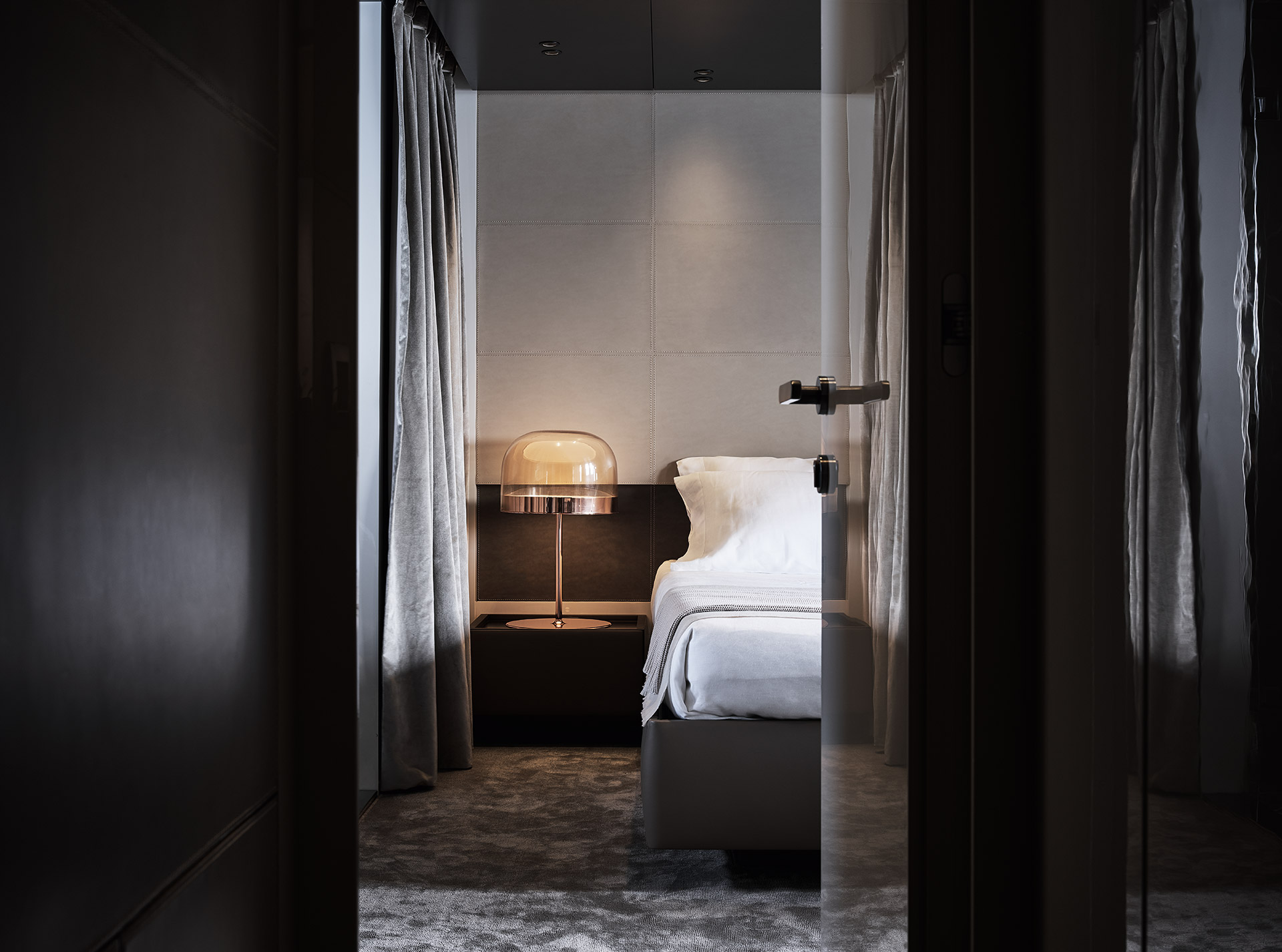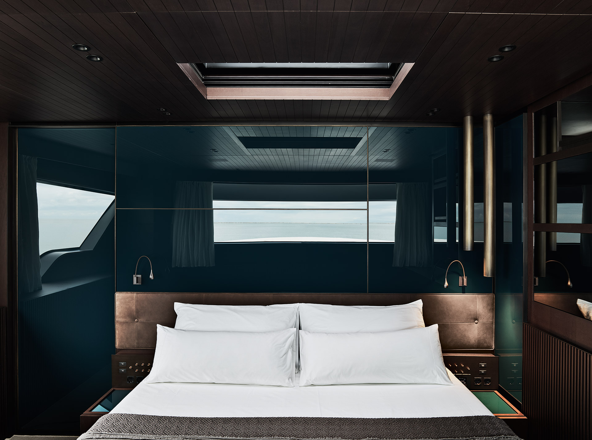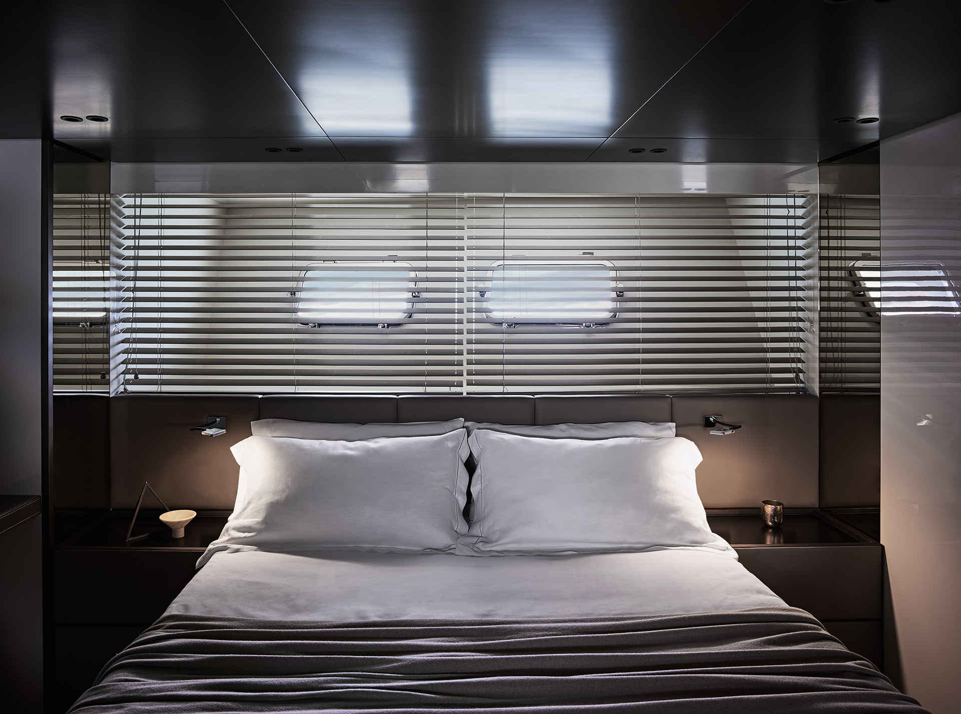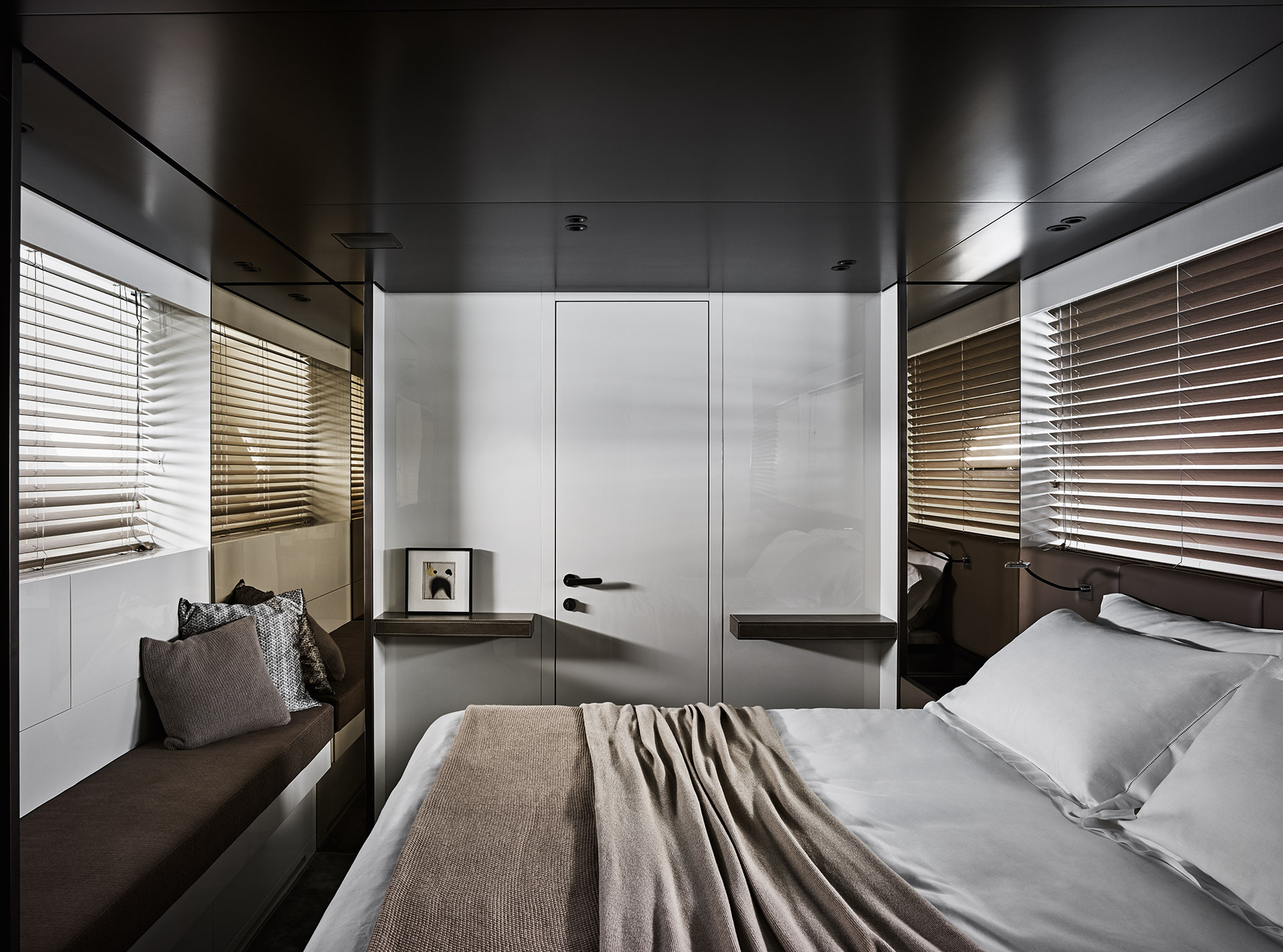 Understated and architectural, the interiors prioritise space over ornament. Clean lines, balanced proportions and soft textures create a composed atmosphere, where light, comfort and functionality define a sophisticated onboard experience.